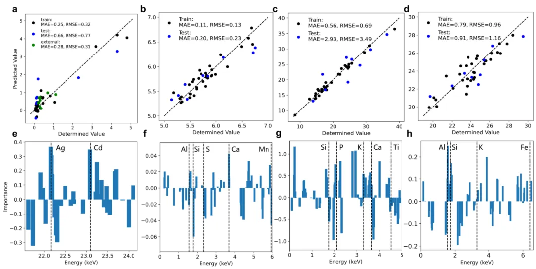 在Cd总量与土壤性质的预测中,研究首先对优化后的XRF光谱进行预处理,并通过竞争性自适应重加权采样(CARS)筛选出与目标变量高度相关的特征变量,有效消除了光谱冗余。随后采用多种机器学习模型构建预测模型。结果表明,偏最小二乘(PLS)回归预测效果最好,该模型在处理低维、低信噪比光谱数据方面具有优势,能够通过提取潜变量实现噪声抑制与有效信号的准确捕获。结果表明,在测试集上,PLS模型对总Cd的预测精度达到MAE为0.66mg/kg,对pH、SOC和黏粒含量的MAE分别为0.20、2.93g/kg和0.9%(图2a-d)。模型的可解释性分析显示,PLS回归系数所识别的关键特征通道(如Cd-Kα、Ca、Si、Al、Fe等)与Cd的地球化学行为及土壤性质的形成机制高度吻合,验证了模型预测的合理性与可信度(图2e-h)。