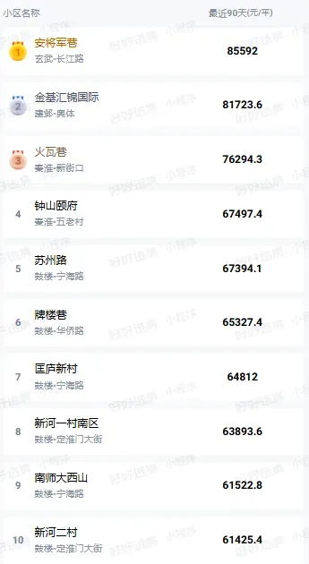 看下过去90天南京二手房成交单价前10名单: