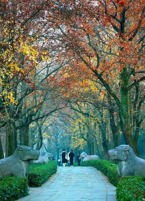 明孝陵的神道是整个景区里最被低估的地方,很多人走得太快错过了两边石像的细节,这些石像不是简单的装饰,是整套明代皇家礼仪体系的具象化,你仔细看会发现每个石像的姿态、表情、细节雕刻都不一样,这种变化本身就是在讲一个完整的故事,而且神道的尽头是一片开阔的湖面,秋天的时候湖水倒映着黄叶和蓝天,那个画面美到不真实。