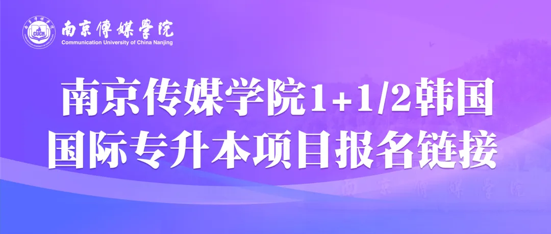 南京传媒学院与韩国知名高校联合开展的"1+1/2韩国艺术名校专转本项目",学生在南京传媒学院完成为期一年的语言强化及专业基础课程后,赴韩国院校继续深造,顺利完成全部学业并符合条件者,将获得韩国院校颁发的学士学位证书,归国后可获得教育部留学服务中心学位认证。本项目为专科学生提供了规范、高效的国际化学历提升通道。