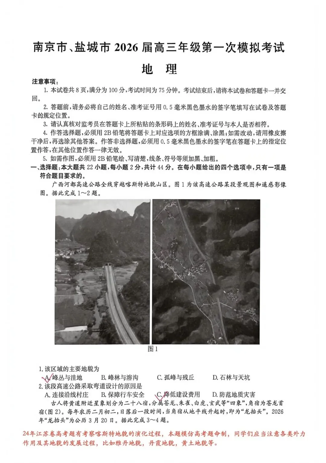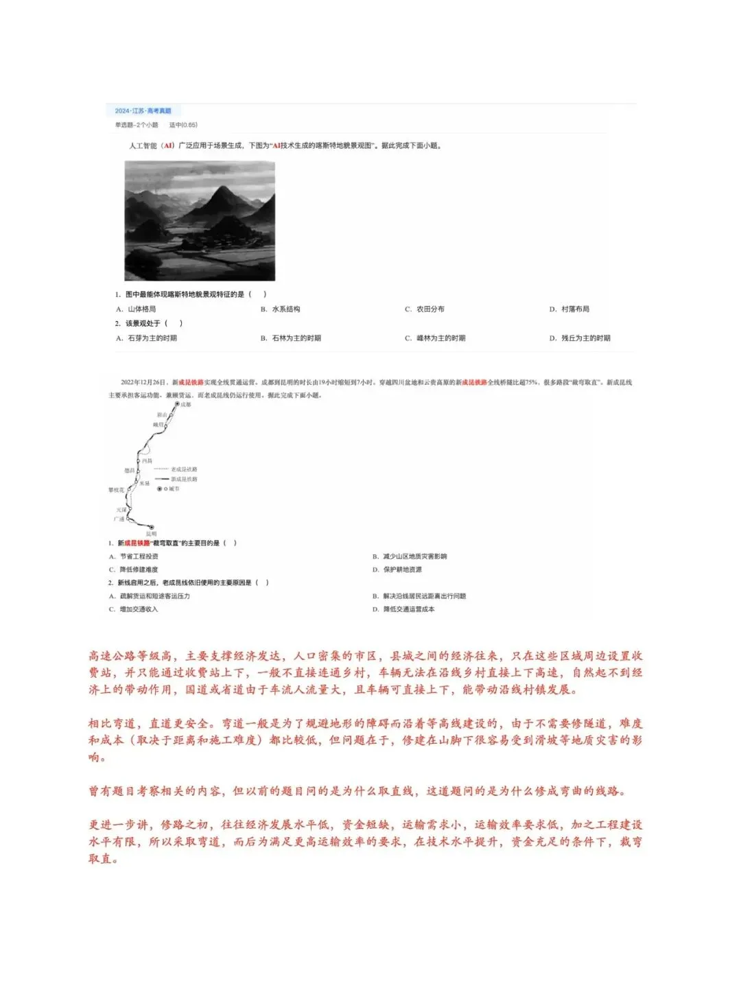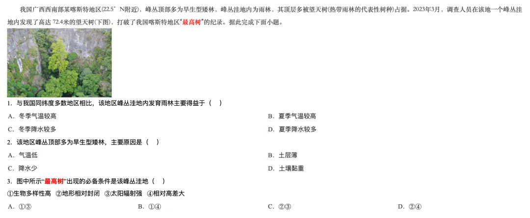 第一、二题:24年江苏卷高考题有考察喀斯特地貌的演化过程,本题模仿高考题命制,同学们应当注意各类外力作用及其地貌的发展过程(早中晚期),比如雅丹地貌,丹霞地貌,黄土地貌等,这部分内容主要在必修一教材中学习,往往大家觉得这部分内容以识记为主,未理解其原理,也没有留意和其他章节的关联,而近年考试多次考察地貌对土壤、水文、植被的影响,应当引起大家注意。