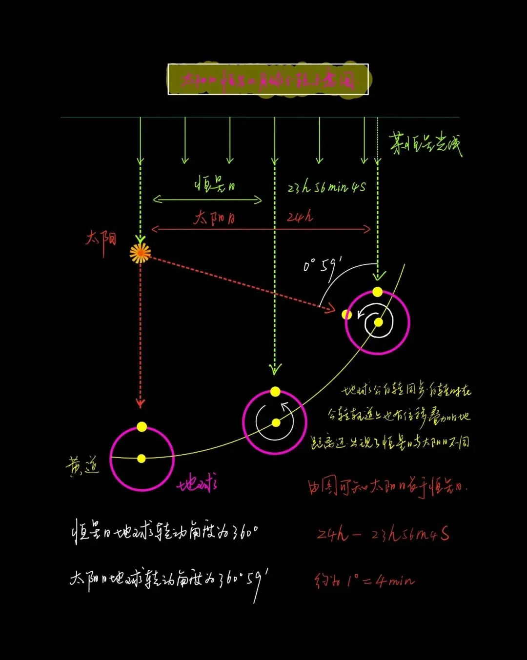 以不同天体为参照物,地球上一天的时长不尽相同,以太阳为参照物,一天是24小时(太阳日),以遥远的天体(如某一颗恒星)为参照物,一天是23小时56分4秒(恒星日)。由于地球自转时也在公转,每自转360°,在公转轨道上也移动一定距离,这就使得两次观察到太阳的时间间隔和遥远天体的时间间隔不同,恒星日略短于太阳日。地球的自转引起天体在一日中做相对运动,即呈现出东升西落的周日视运动轨迹,如此一来,假设某一天太阳和某一遥远天体同时从东方地平线升起,又同时从西方地平线落下,次日再观察时,某一遥远天体就会比太阳提前4分钟(在天空中的弧度约为1°)左右出现在东方地平线上,整体上看,位置更偏西,如此,每日提前(或偏西)约1°,则一年完成一个循环,周而复始。所以本题移动方向是自东向西,成因是公转(或者说自转同时在公转)