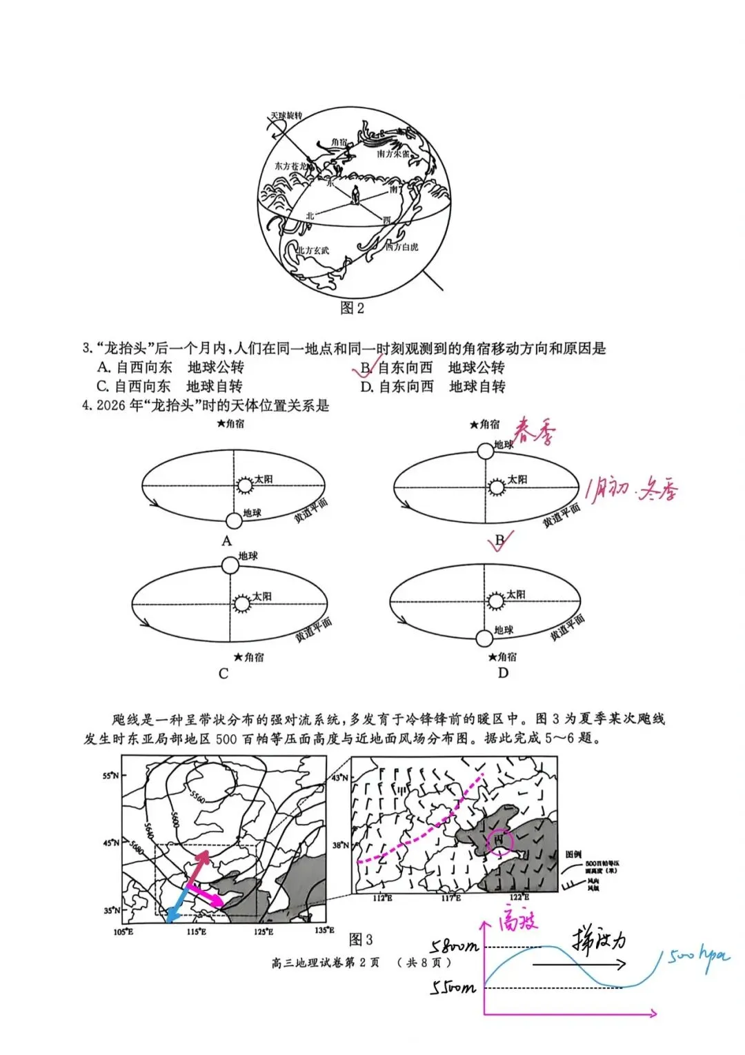 一部分是三圈环流、季风环流与气候以及天气系统,这部分知识点往往是教学重点,同学们都比较重视,所以主要通过做题总结思路,比如时空分布的匹配(天气系统位置、影响与时间),大气特征与天气系统关系(温度、湿度、气压的变化)等,具体不再展开。