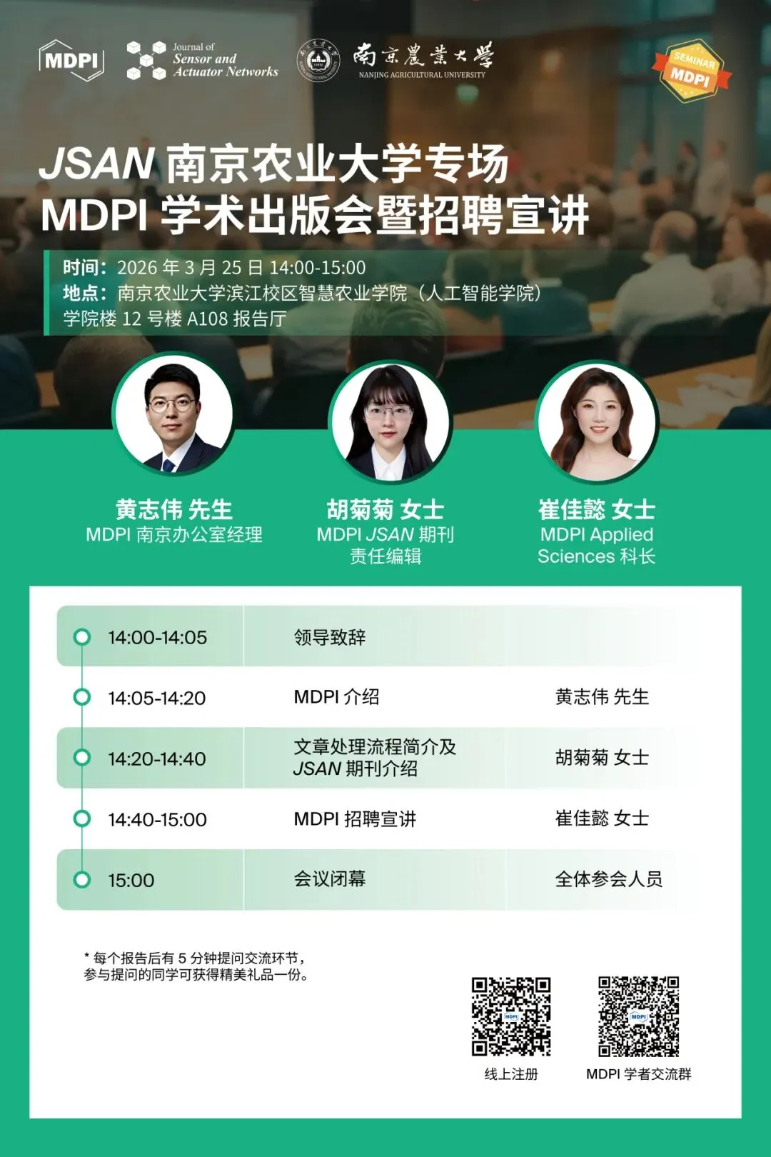 本次活动,我们非常荣幸地邀请到南京农业大学的舒磊教授作为会议主席,MDPI南京办公室经理黄志伟、JSAN 期刊责任编辑胡菊菊以及MDPI Applied Sciences 科长崔佳懿三位主讲人。各位主讲人将围绕以下话题为大家带来精彩的报告:MDPI介绍、文章处理流程简介及 JSAN 期刊介绍、MDPI招聘宣讲。欢迎大家积极参与!