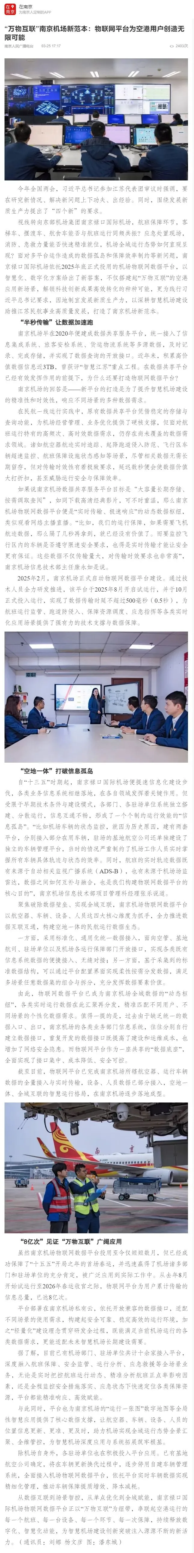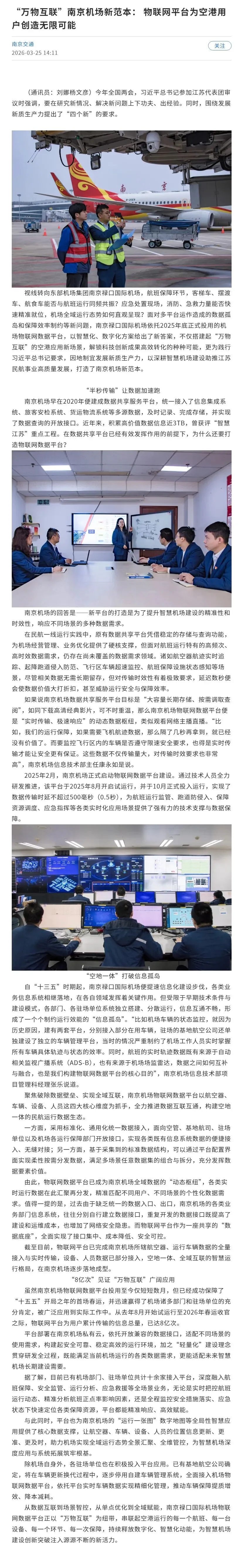 从“半秒传输”的极致时效,到“8亿次”的信息流转,南京机场以物联网平台打破信息孤岛,实现“空地一体”数据互联,让“万物互联”在航班保障、安全监管、应急指挥等全场景中照进现实,为智慧机场建设打造了可复制的新范本。