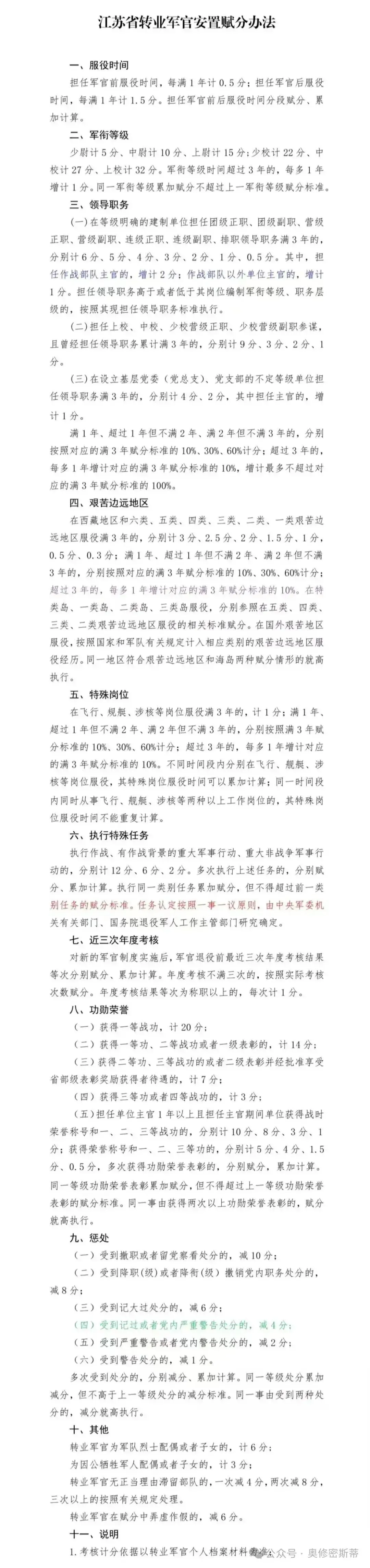 《江苏省转业军官安置赋分办法》明确,转业军官档案分计算主要包括:服役时间、军衔等级、领导职务、艰苦边远地区、特殊岗位、执行特殊任务、近三次年度考核、功勋荣誉、惩处、其他等10个方面。赋分办法明细见下图: