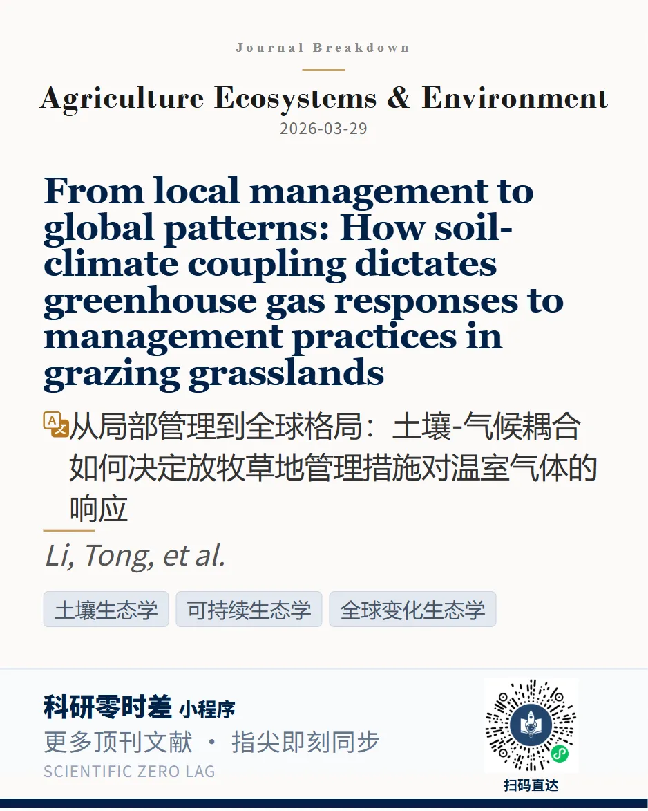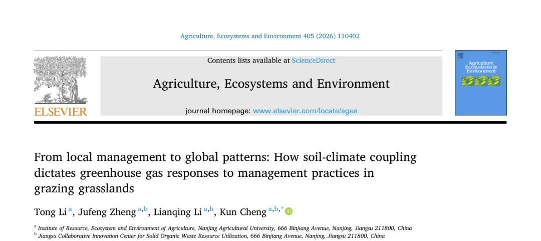 我们通过小程序科研零时差追踪到: Agriculture, Ecosystems and Environment近期发表题为“From local management to global patterns: How soil-climate coupling dictates greenhouse gas responses to management practices in grazing grasslands”的文章。第一单位为南京农业大学。