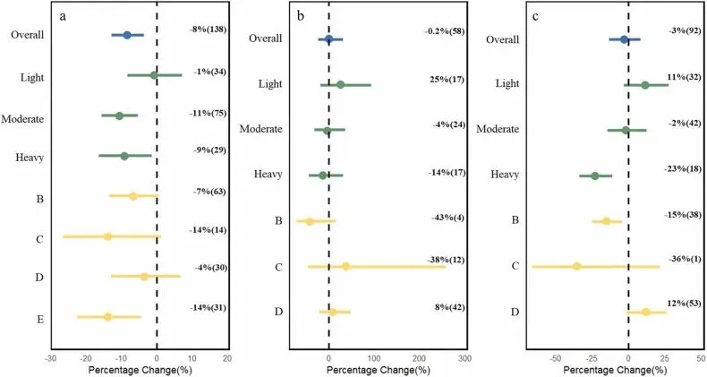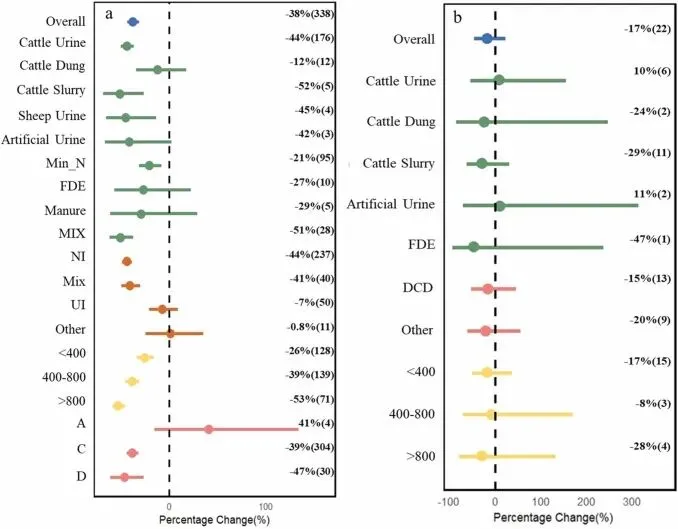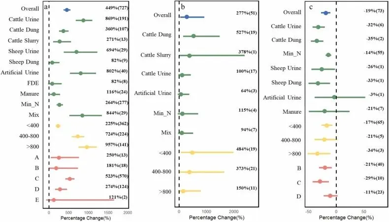 ▲Figure 2. 放牧对SOC和温室气体通量的影响图表展示策略上,作者利用带有误差棒的散点分布图来直观展示整体效应及各个亚组的平均效应。如图2至图4所示,这种展示方式的优势在于:读者可以直观地通过置信区间是否与零线交叉来判断某项管理措施的整体影响是否具有统计学显著性,同时,亚组分析的结果清晰地展示了不同强度、不同气候带或不同肥料类型下的差异表现。