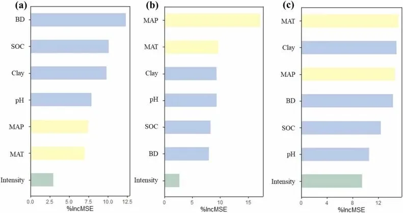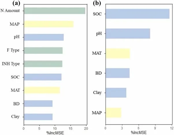 ▲Figure 4. 添加抑制剂对温室气体通量的影响第三步,引入随机森林算法解析空间变异的驱动因子。这是本文在方法学上的一大突破。传统的Meta回归通常预设变量之间存在线性关系,在面对多重共线性和高维数据时容易产生偏差。而_随机森林算法作为一种集成机器学习方法,能够极好地捕获复杂的、高阶的非线性生态模式,且无需预先进行严格的参数假设_。作者将计算得出的效应量作为因变量,将各项气候和土壤变量作为自变量输入模型。为了最大化利用有限的数据并防止过拟合,研究实施了五折交叉验证。