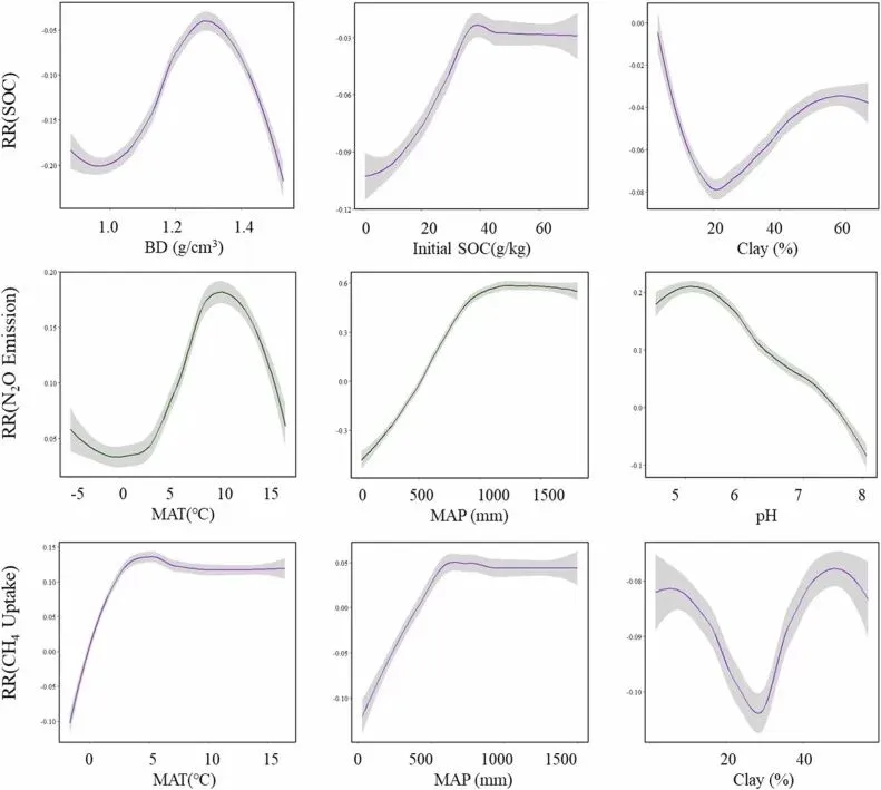 ▲Figure 6. 环境变量对放牧效应的边际影响非线性关系例如,模型结果清晰地展示了初始土壤碳含量如何调节放牧效应:初始碳含量与放牧导致的碳变化呈现正相关,这意味着初始碳水平较高的土壤在适度放牧下更具有维持或固存碳的潜力。同时,边际效应曲线展示了土壤容重的阈值效应,当容重超过特定数值时,碳变化呈现出急剧下降的趋势,这反映了土壤压实对根系生长和碳输入的负面物理限制。