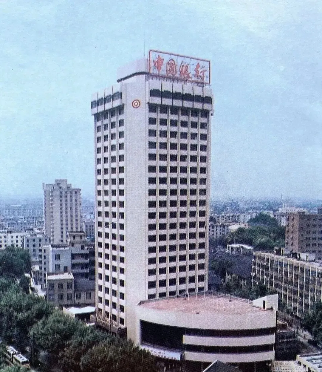 这幢高楼就是熟悉的中国银行大楼,楼顶大红招牌,一眼就能认出,小时候跟着大人去银行存钱,玻璃门厚厚的,门口拉绳子维持队伍秩序,那种认认真真存几百块的满足感,现在手机一戳啥都能转账,老银行那种肃穆热闹的感觉早没了。