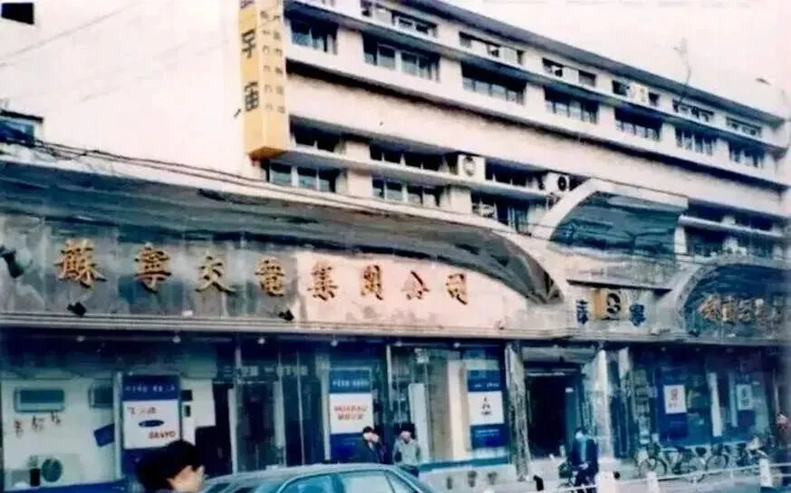 门头金字一横拉到底,店面左边还有“苏宁”大红招牌,苏宁交电是南京人换家电的热门地,家里冰箱、彩电、空调,有一半出自这,小时候小板凳一溜趴窗外看新款电视机播动画片,老板用遥控器给大家介绍功能那架势真不含糊。