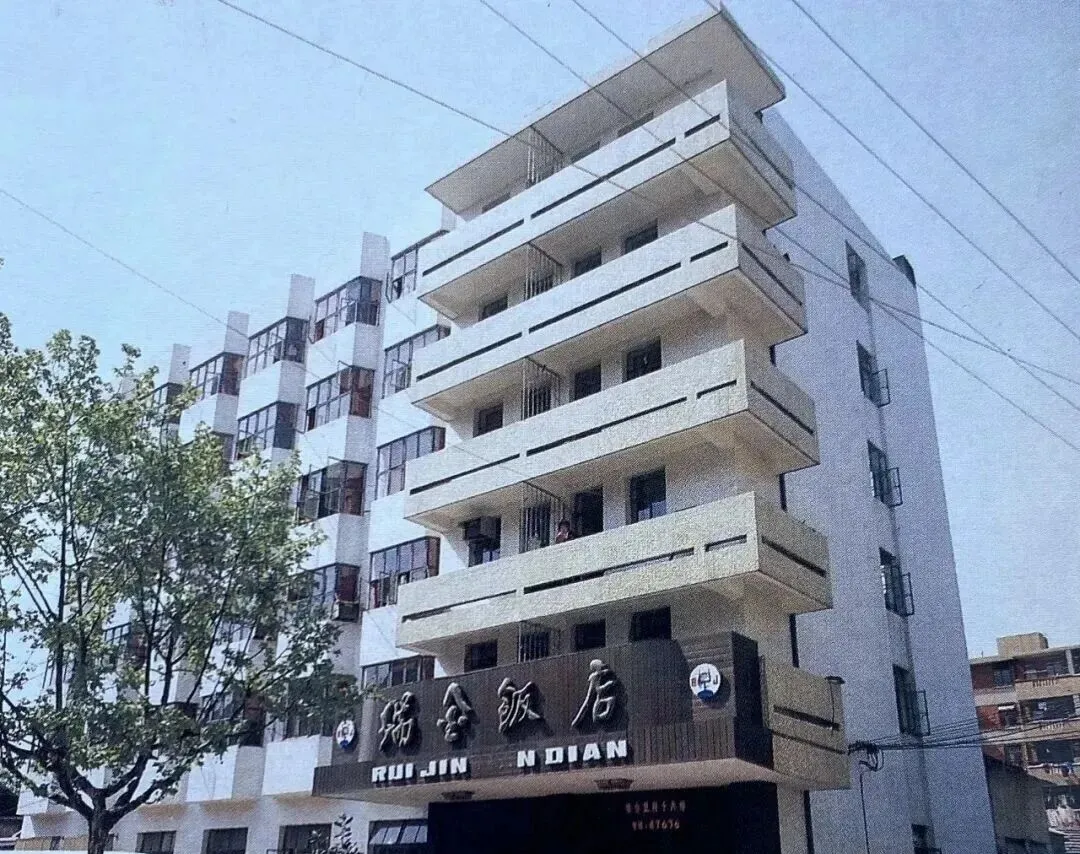 六层白墙加一溜大阳台,楼下是瑞金饭店,门口树荫遮挡,楼上一排人在窗台探头看楼下,是那个年代旅社该有的生活场景。