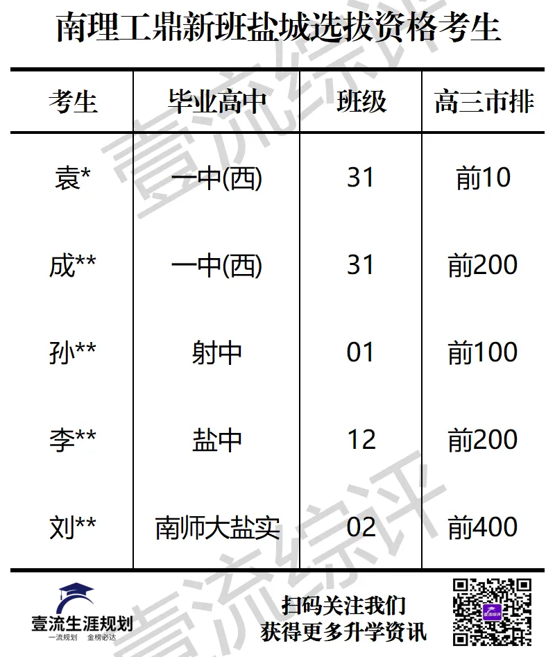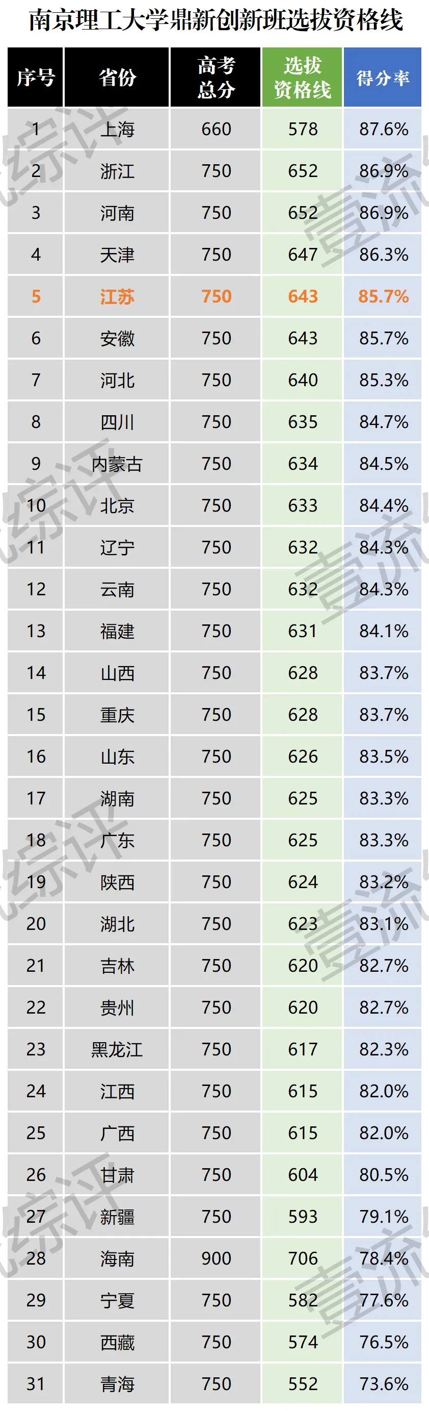 钱学森学院内的鼎新创新人才班每年新生开学前会进行二次选拔,2025年全国各省份的选拔下如图。从各省份选拔资格线与高考总分的占比看,江苏排名第五,得分率达85.7%。上海高考总分660分,选拔资格线578分,得分率87.6%最高。排名后三位的是青海省,552分,得分率73.6%;西藏574分,得分率76.5%;宁夏582分,77.6%;以下为2025届南京理工大学盐城具备选拔资格的考生,共计5人。不含直接被鼎新班录取的考生。需要说明的是,高考直接被鼎新班录取的考生无需参加笔试,但需要填写方向志愿表并参加面试。最后,想要精准高考规划和定位的盐城考生,请持续关注壹流综评的相关报道。