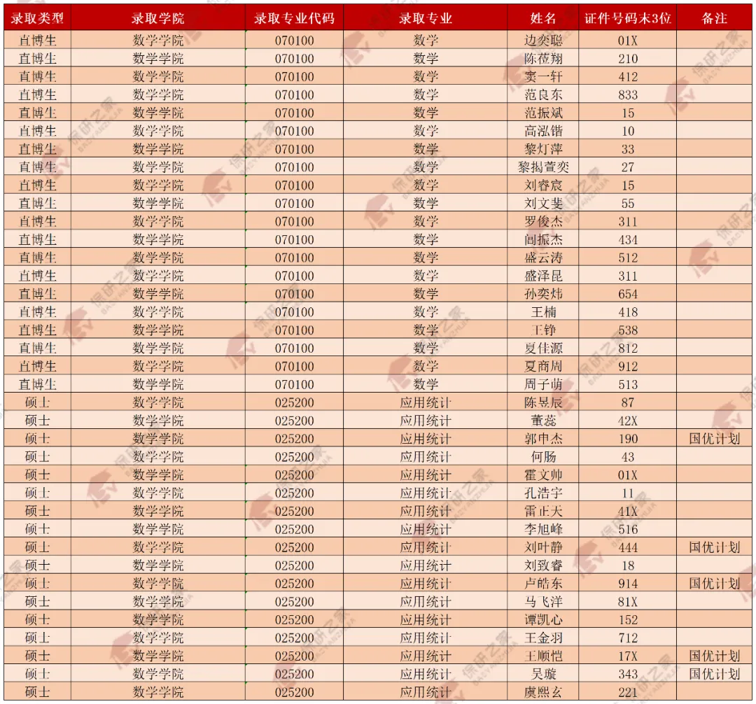 南京大学数学学院2026级拟录取推免生包括硕士和直博,共有2个专业:数学、应用统计。
