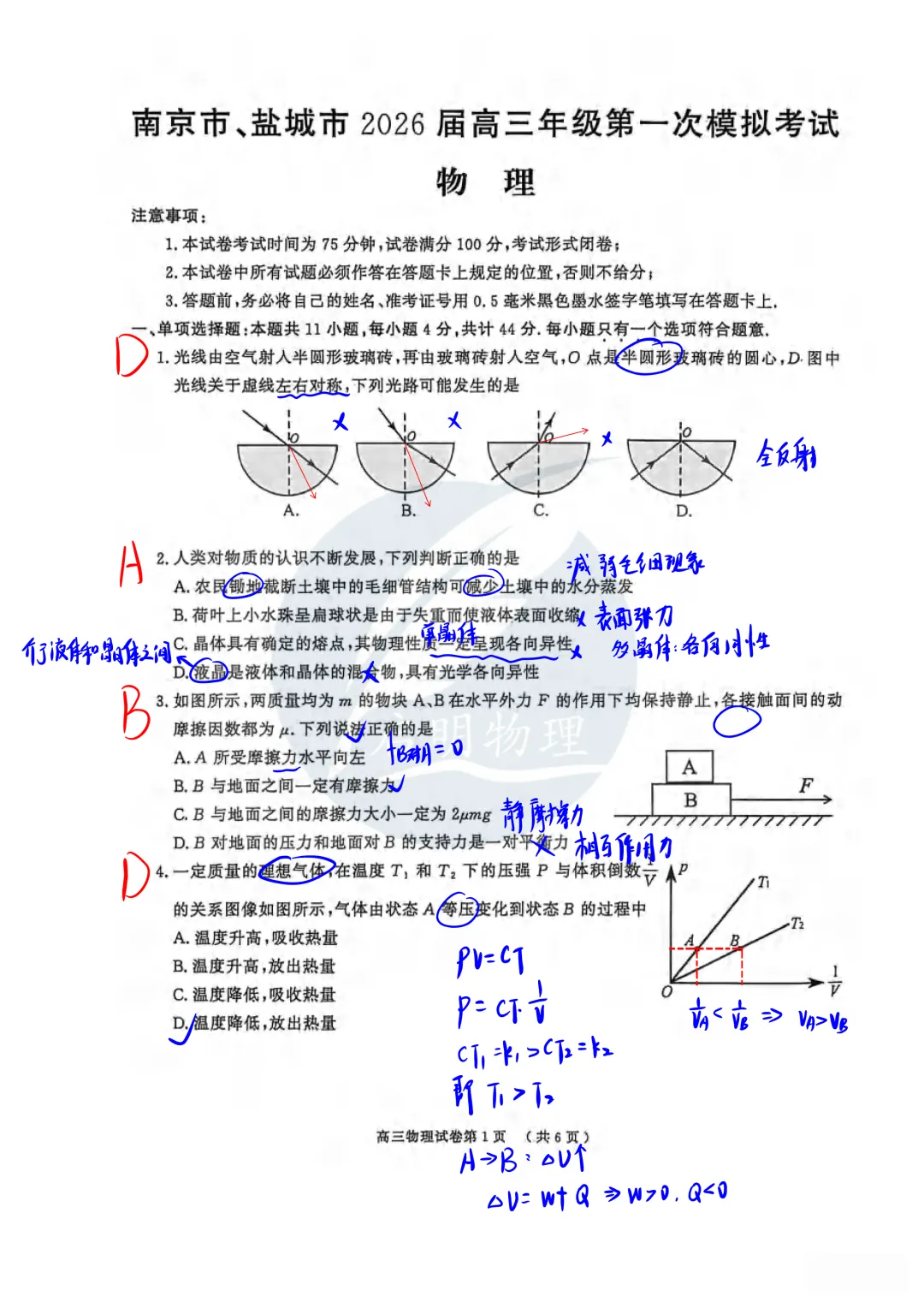 >【高三物理】26年南京盐城高三一模手写解析