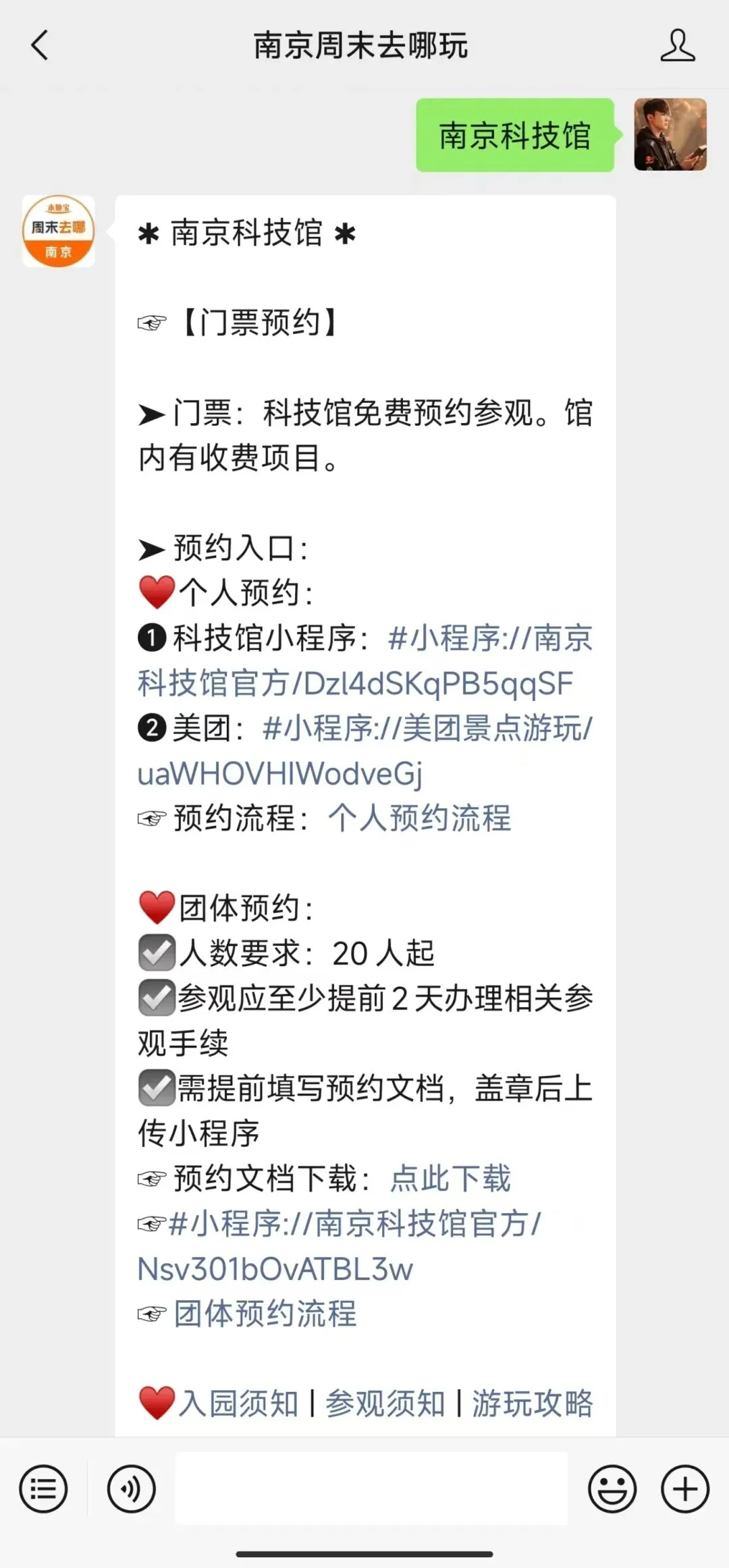 小编提醒:扫描下方二维码,关注【南京周末去哪玩】微信公众号,后台对话框回复【南京科技馆】即可获得预约入口