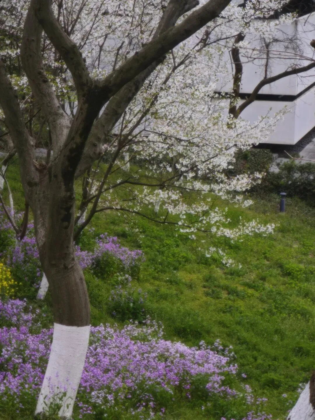 我站在花树下,看建筑的硬朗与繁花的娇柔,
