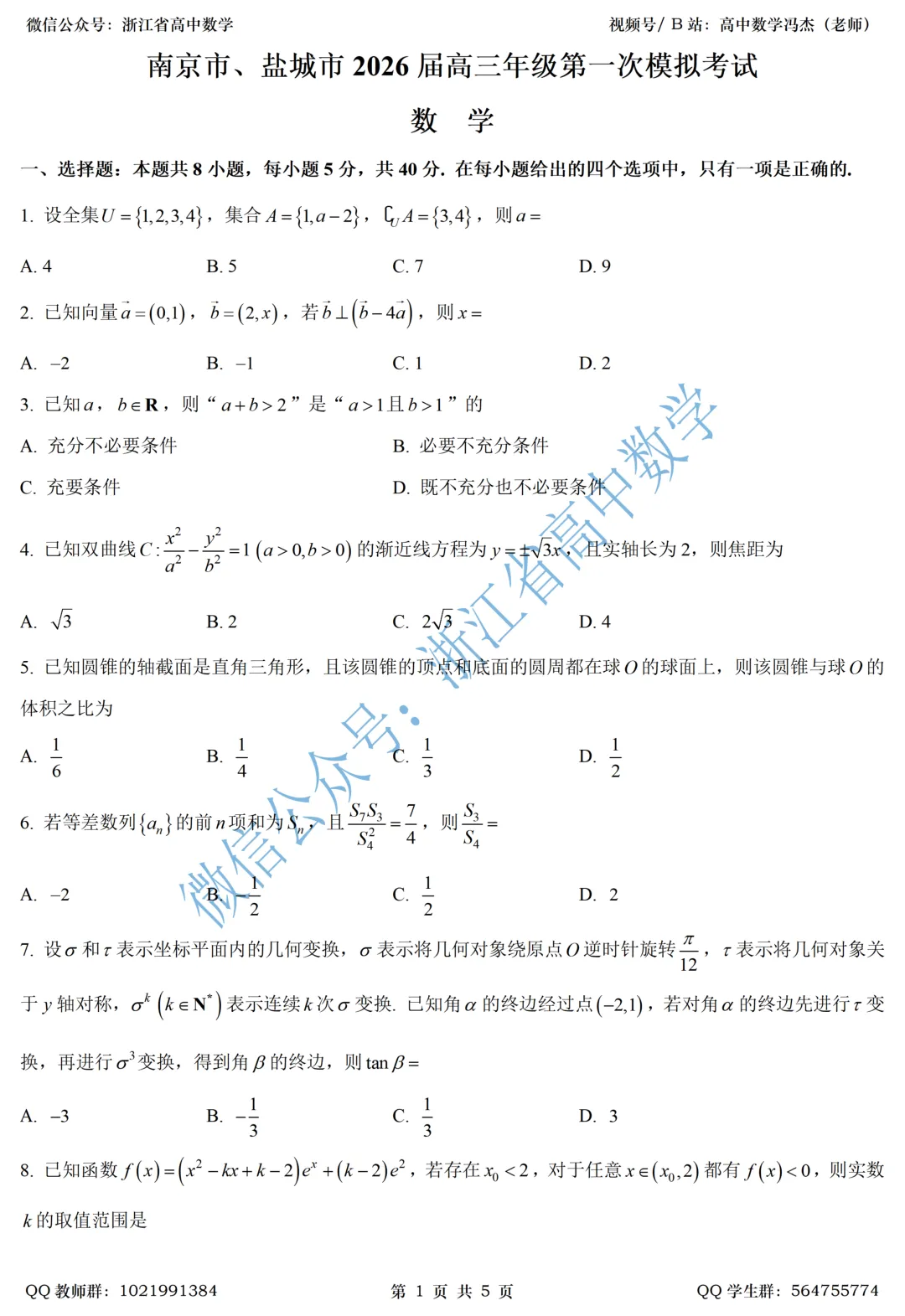 今天依然是浙江省外好卷全解析!而今天我们要聚焦的是刚刚考完的南京、盐城一模!和我们浙江一样,江苏也是使用全国一卷的省份。江苏有三大神卷,我们每一届都会解析,分别是苏锡常镇、苏北七市,以及南京、盐城一模。散装江苏,名不虚传。前两个我们已经解析完了,今天带来最后一份——南京、盐城的全解析。这份试卷整体节奏做起来非常舒服:前6道简单题帮同学们快速进入考试状态,后面的难题该难的难,该拔高的拔高。尤其是最后一道压轴大题,解析几何结合数列,极具创新度。省会就是省会呀!