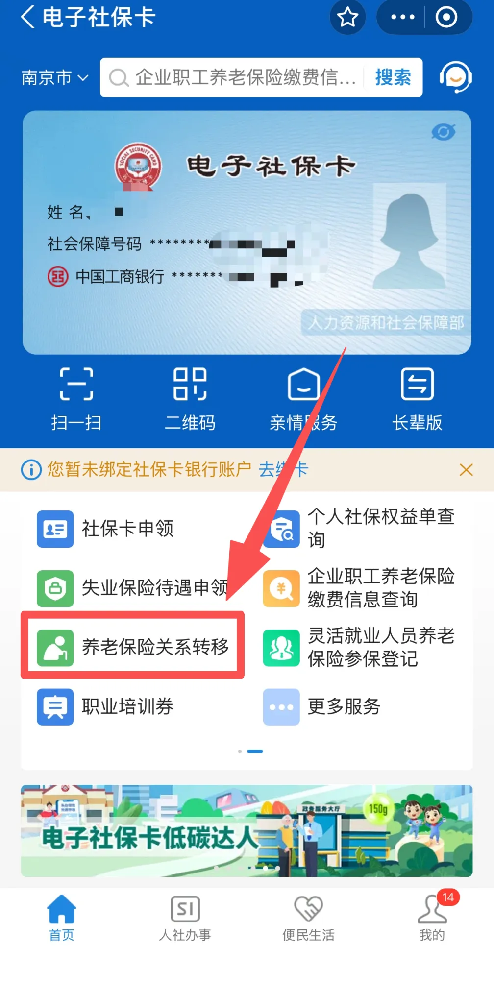4.微信或支付宝搜索“电子社保卡”小程序,按要求领取电子社保卡——养老保险关系转移——我要申请