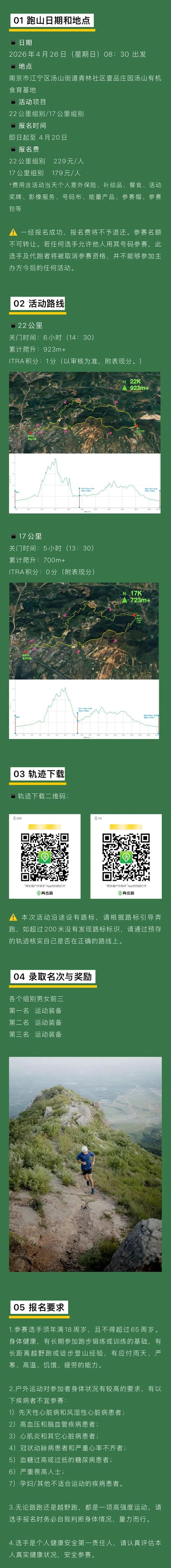 2026山径探索四月跑山训练赛定于4月26日(周日)8:30在南京市江宁区汤山街道青林社区壹品庄园汤山有机食育基地开跑,设22公里、17公里两个组别;先报先得,额满即止!