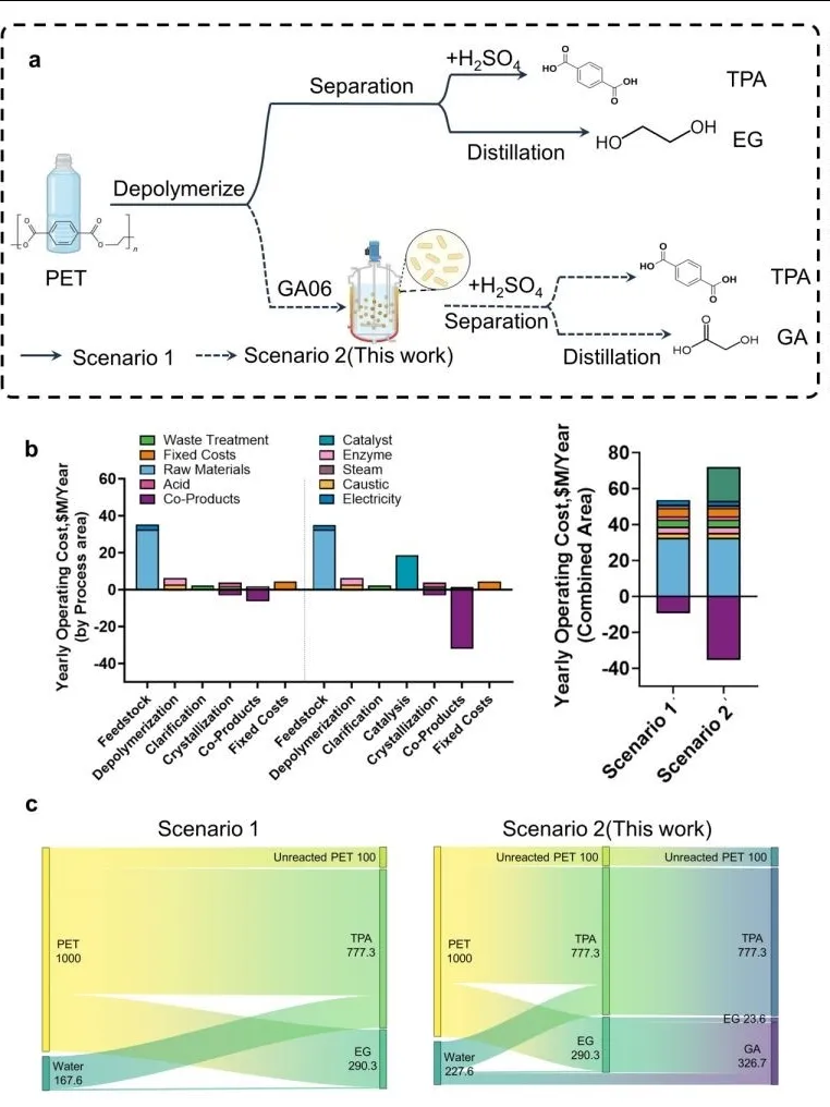 在合成生物学赋能循环经济的浪潮中,PET(聚对苯二甲酸乙二醇酯)的酶法解聚是近年来的绝对热点。然而,业界往往聚焦于TPA(对苯二甲酸)的回收,却忽略了另一半产物——乙二醇(EG)。EG沸点高、分离能耗大、且作为大宗化学品价值有限,成为了拖累PET酶法回收经济性的“隐形短板”。近日,南京工业大学姜岷团队在《Green Chemistry》发表重磅研究。他们并未止步于解聚,而是通过精妙的代谢工程策略,构建了高效的大肠杆菌细胞工厂,将PET水解液中的EG原位转化为高附加值的乙醇酸(GA)。这一策略不仅解决了分离难题,更将回收过程的运营成本降低了17.59%。这不仅是一个代谢通路的构建工作,更是一个“生物炼制+化工分离”耦合优化的范例。