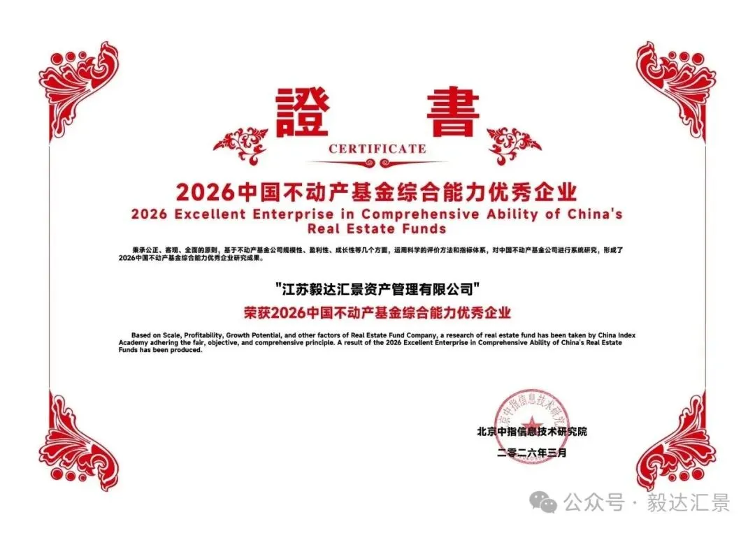 近日,2026年不动产基金优秀企业排名发布会举办,江苏毅达汇景资产管理有限公司连续第九年斩获中国不动产基金综合能力优秀企业TOP10,稳居行业前五强。