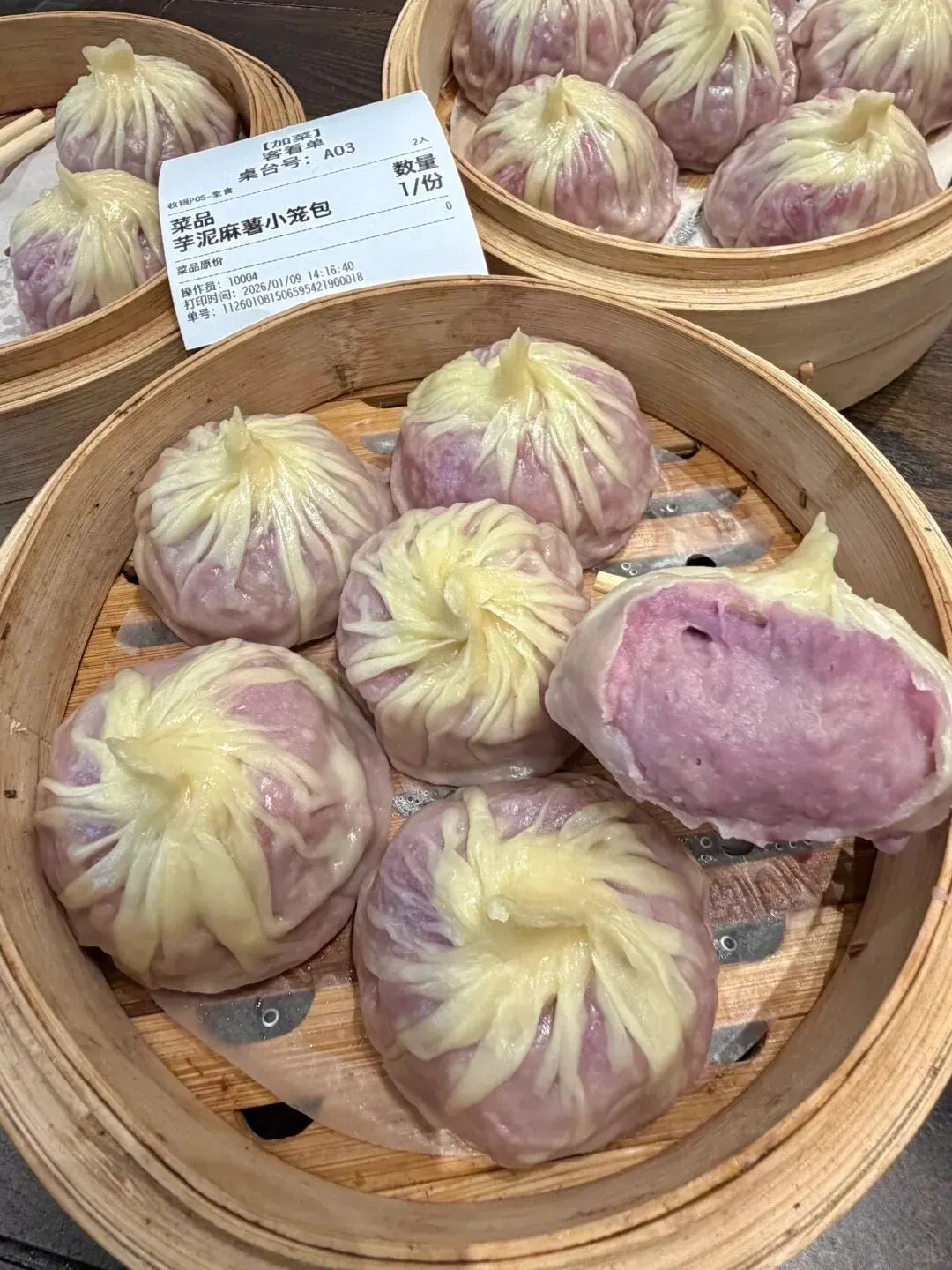 喜欢甜口的千万别错过芋泥麻薯小笼包和桂花糖炒圆子,薄皮里塞满了绵密的芋泥和拉丝麻薯,热乎乎地吃进嘴里又甜又糯。