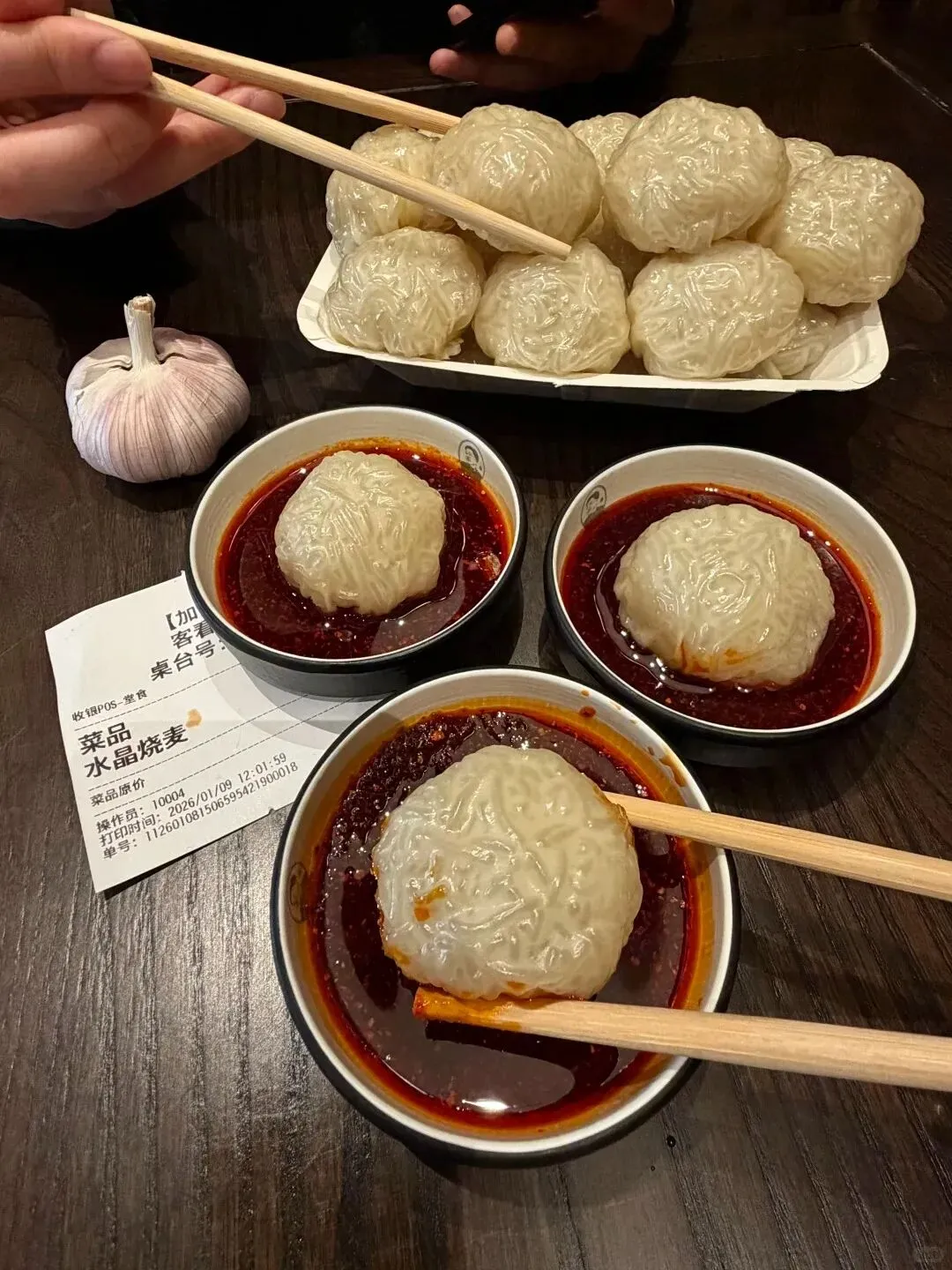 水晶烧卖则是晶莹剔透的,蘸着店里的红油辣子吃简直是绝配,越嚼越香。