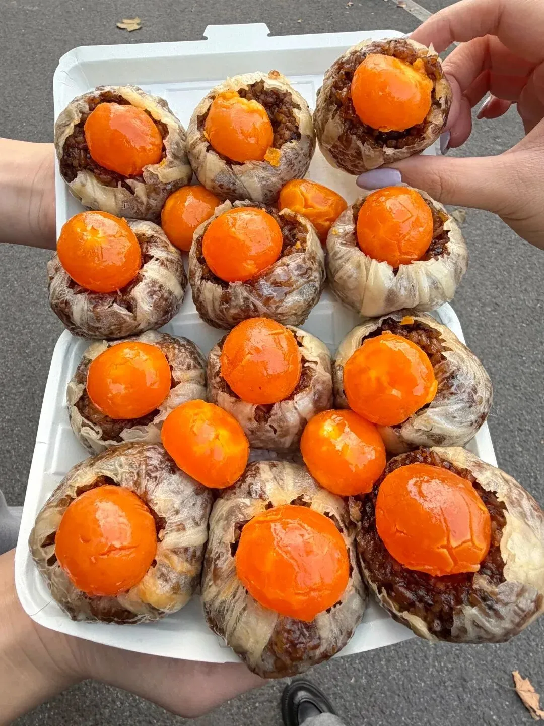 一口咬下去是一整颗冒油的咸蛋黄,和糯米混合在一起咸香软糯,完全不会觉得顶肚子。