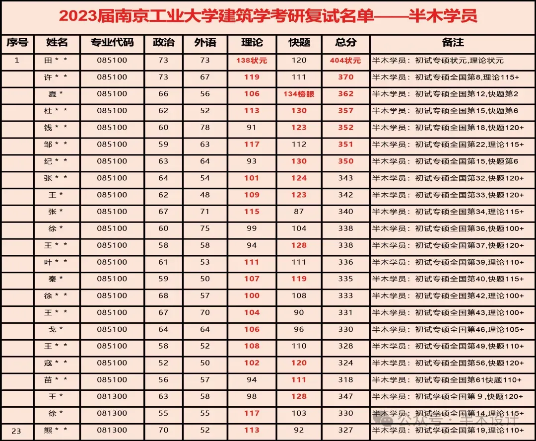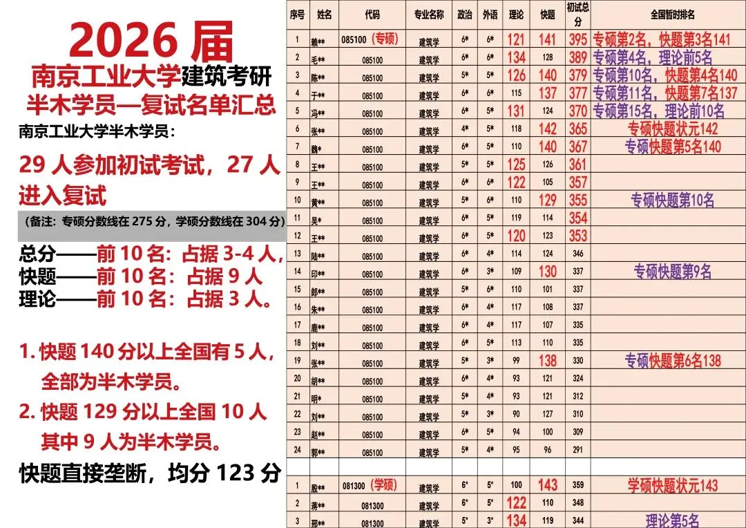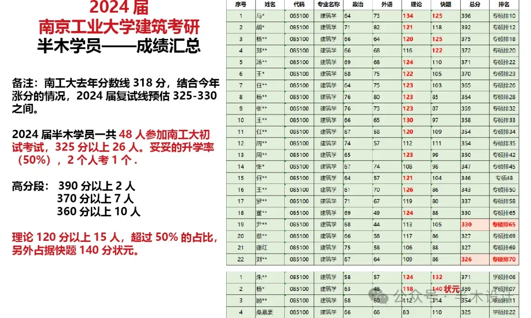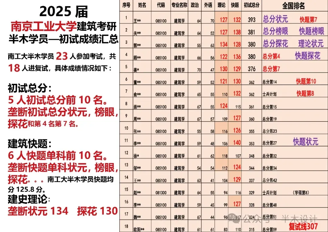 2019届南工大全国进复试51人,其中保研2人,专硕42人,学硕7人; 学硕方面:半木学员报名3人,1人考取学硕全国第3; 快题方面:全国快题超过130分有7人,半木学员占5人; 理论方面:全国建筑史超过115分有8人,半木学员占4人;2020届南工大建筑学全国进复试: