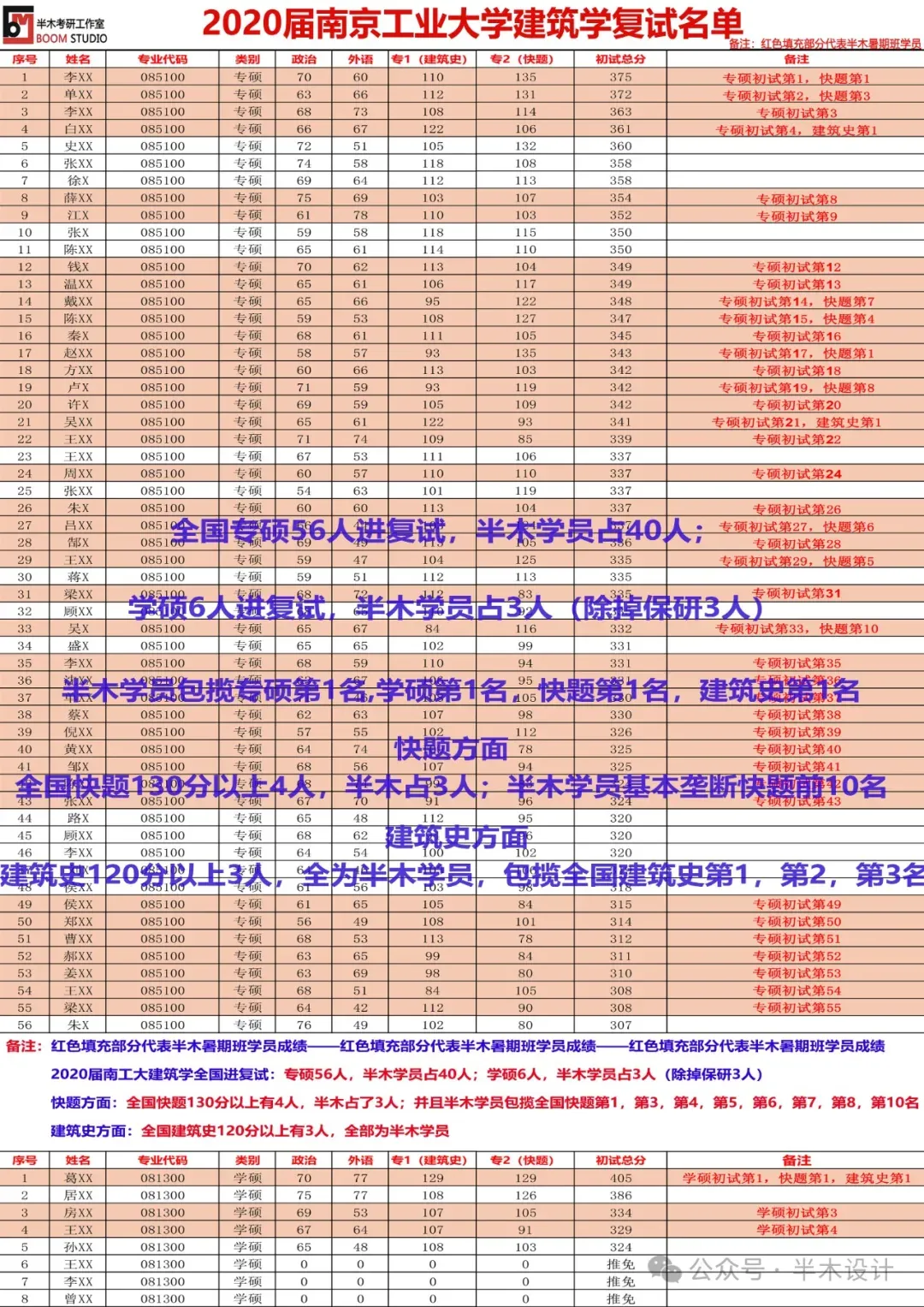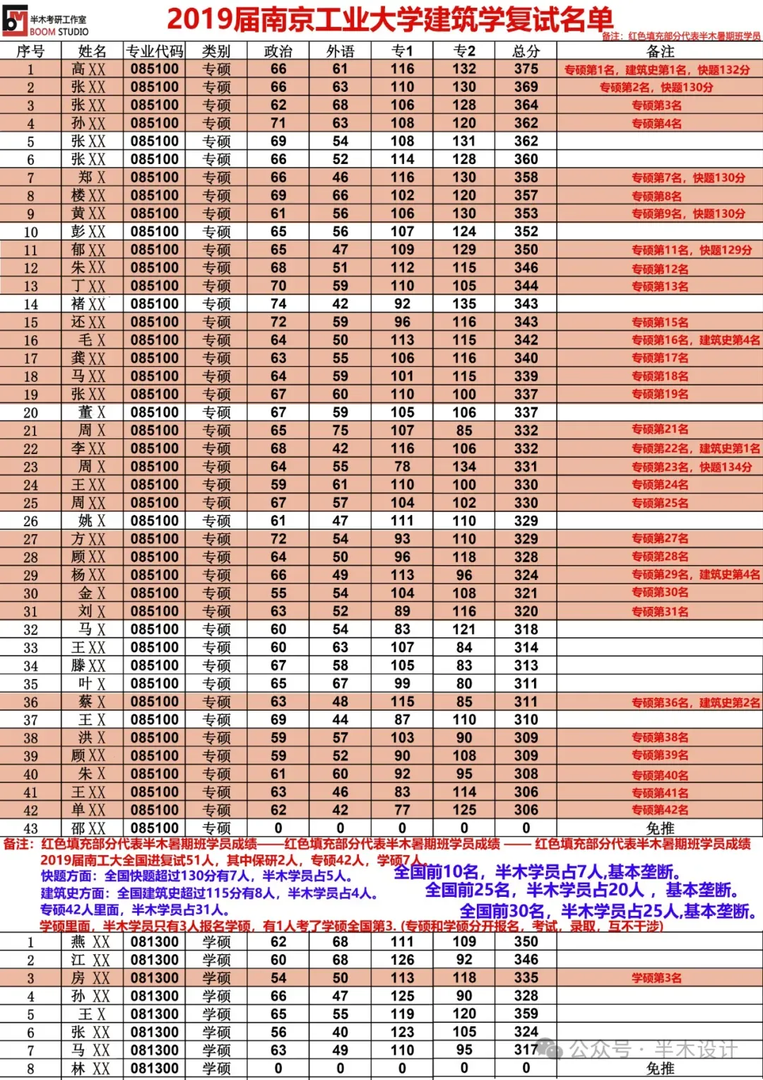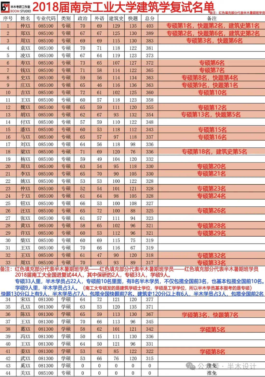 2019届南工大全国进复试51人,其中保研2人,专硕42人,学硕7人; 学硕方面:半木学员报名3人,1人考取学硕全国第3; 快题方面:全国快题超过130分有7人,半木学员占5人; 理论方面:全国建筑史超过115分有8人,半木学员占4人;2020届南工大建筑学全国进复试: