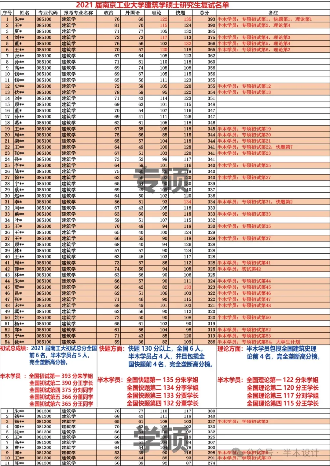 理论方面:半木学员包揽全国建筑史理论前4名,完全垄断高分榜;