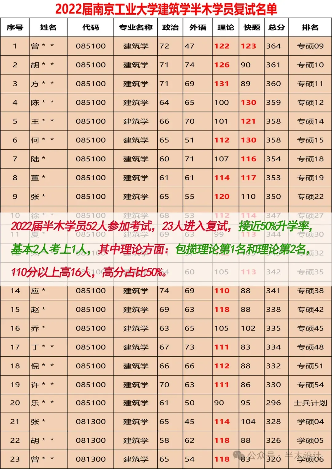 2022届半木学员52人参加初试,其中23人进入复试,