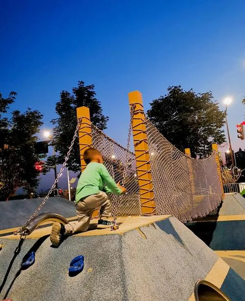 公园里的儿童游乐区不是那种摆设型的,是真的能让娃自己玩起来的,滑梯、沙坑、攀爬架分布得刚刚好,娃从这个跑到那个,中间不用你抱不用你哄,你就坐在旁边看着,偶尔拍个照发个朋友圈,这种体验对宝妈来说就是奢侈品,因为太多公园的儿童区要么太小娃五分钟就玩腻了,要么设计得反人类,娃玩不明白还得你陪着演示,累不累。