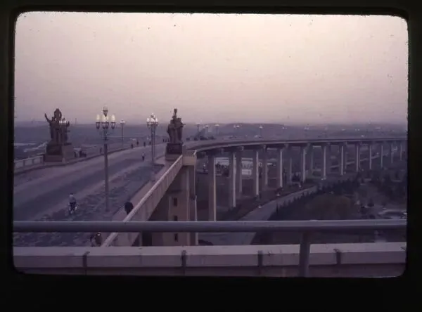 1977年3月23日,南京长江大桥。桥头矗立着工农兵学商群像雕塑,是南京长江大桥小堡的典型特征,代表着当时中国社会的五大组成部分。桥上可见行人与骑自行车的市民,路灯为经典的多头玉兰灯样式,远处是开阔的郊野地貌,与如今的城市景观形成鲜明对比。