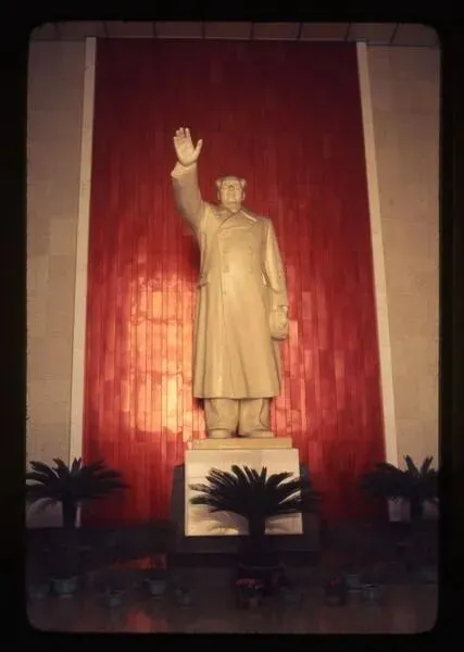 1977年3月23日,南京长江大桥上的毛主席雕像。汉白玉材质的毛主席挥手塑像,身着双排扣大衣,右手高举致意,左手持帽,是中国社会主义建设时期极具代表性的雕塑样式。