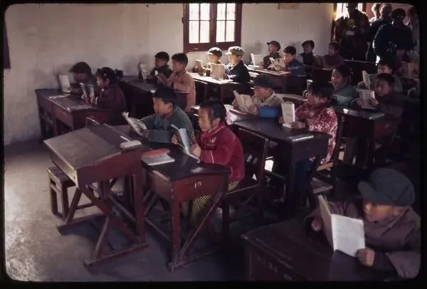 1977年3月23日,南京的小学教室,端坐着读书的小学生。孩子们坐在老式木质课桌椅前,手持课本专注朗读,神态认真质朴,展现出浓厚的学习氛围。孩子们穿着厚实的棉衣、夹克,部分戴着帽子,衣着朴素实用,反映了当时的物质生活水平。