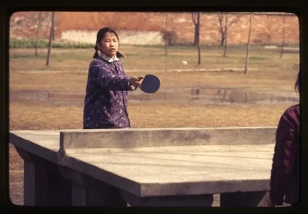 1977年3月24日,打乒乓球的南京小学生。球台是典型的水泥乒乓球台,表面粗糙、边缘有磨损,是 80 年代中国学校最普遍的体育设施,无需专业场馆,随处可打。乒乓球被誉为中国 “国球”,在 70 年代是普及率最高的全民运动,校园水泥球台是几代人的共同记忆,承载着简单纯粹的快乐。