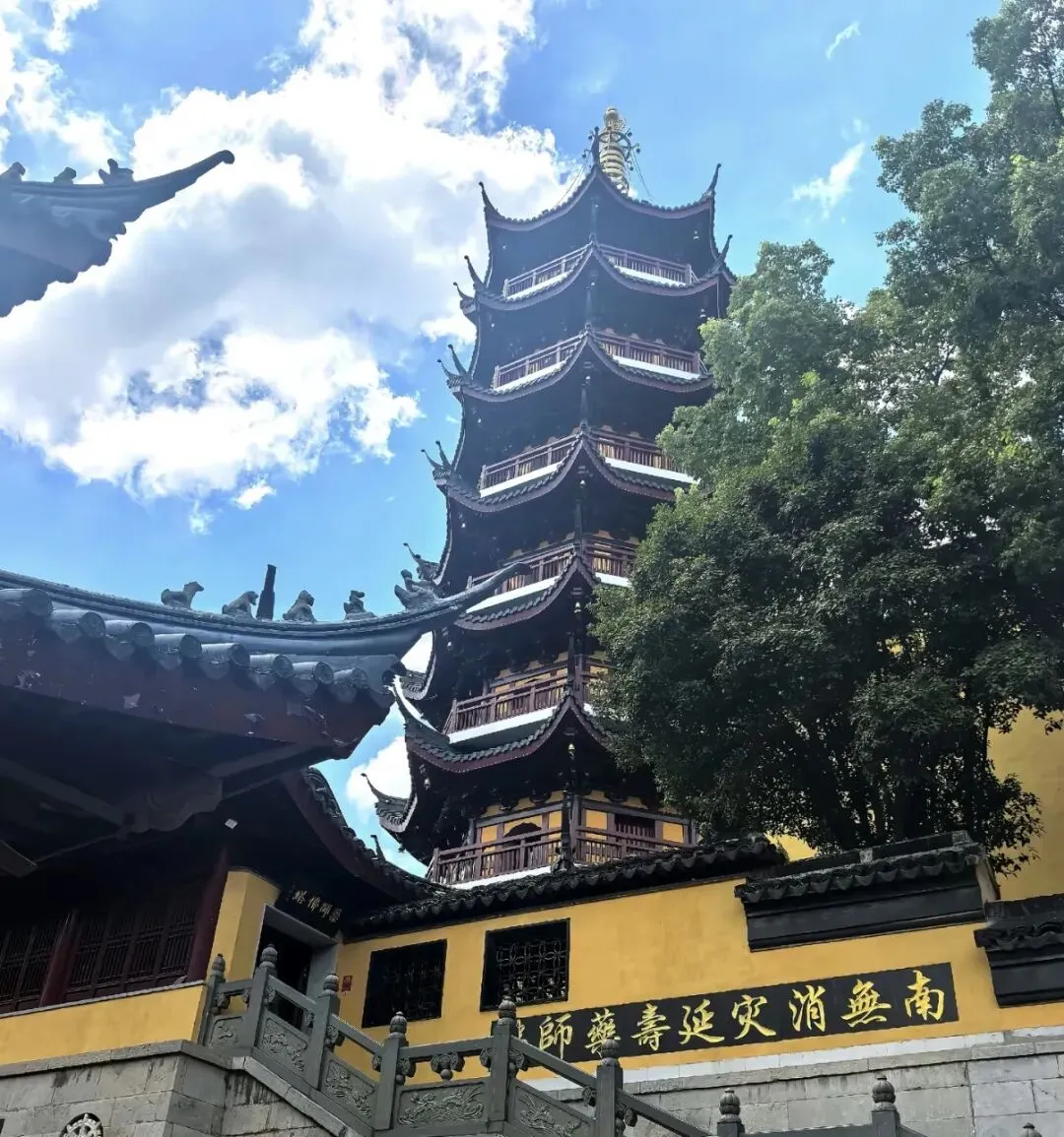 最醒目的莫过于七层八面的药师佛塔,飞檐翘角,金顶在阳光下熠熠生辉。站在塔下仰望,层层斗拱精巧繁复,每一片瓦当都刻着岁月的纹路。登塔远眺,玄武湖的碧波、紫金山的黛色、南京城的烟火尽收眼底,金陵城的温柔与壮阔,在这一刻完美交融。