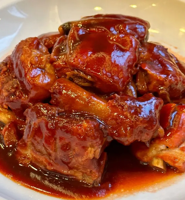 酱排骨的做法不复杂,先焯水,再用酱油、冰糖、黄酒慢炖。火不能急,得让甜味慢慢吃进肉里,骨边那点胶质收住了,入口才会软,筷子一碰就开。