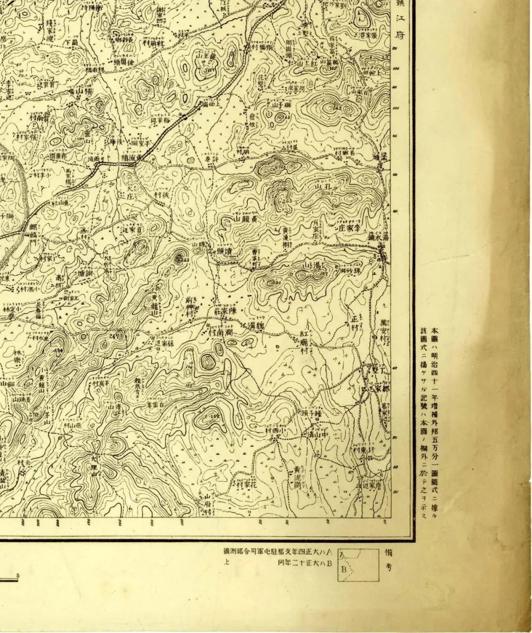 从地图的备考来看,也有1915年和1923年日军的中国驻屯军司令部测图部盗测的信息。图中没有出现我国的测量机构和年号,所以这张地图应为日本人实测而成。