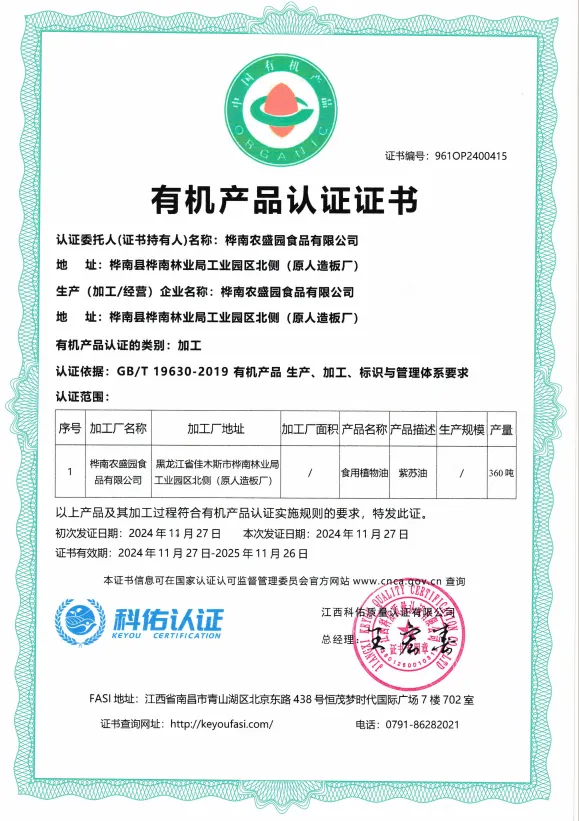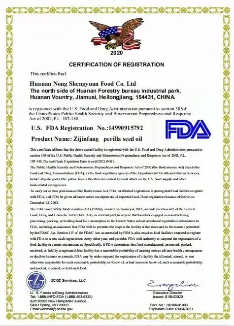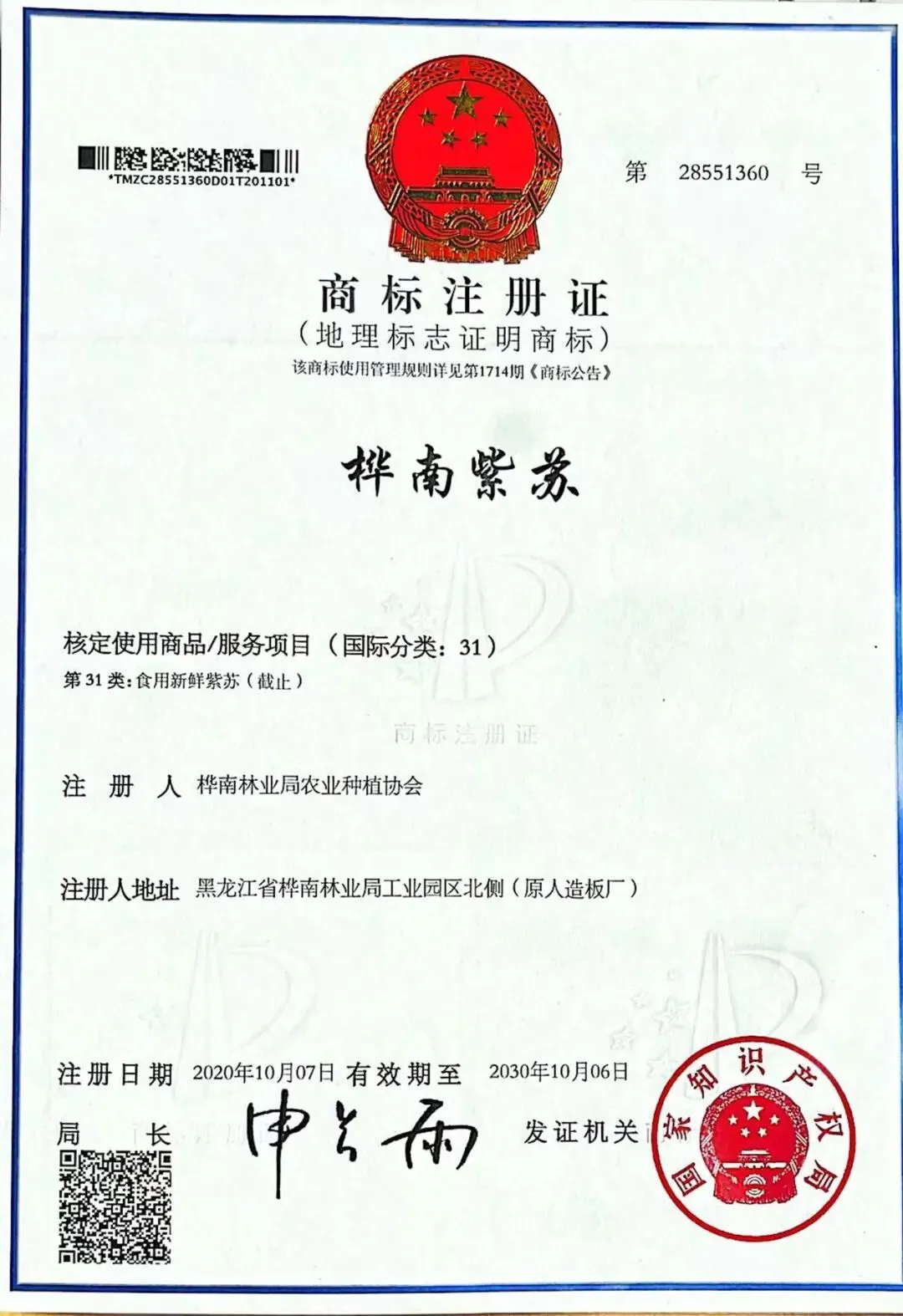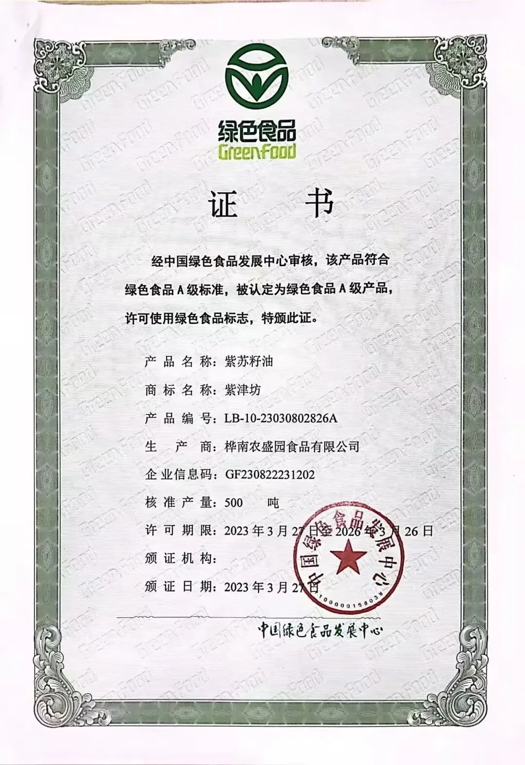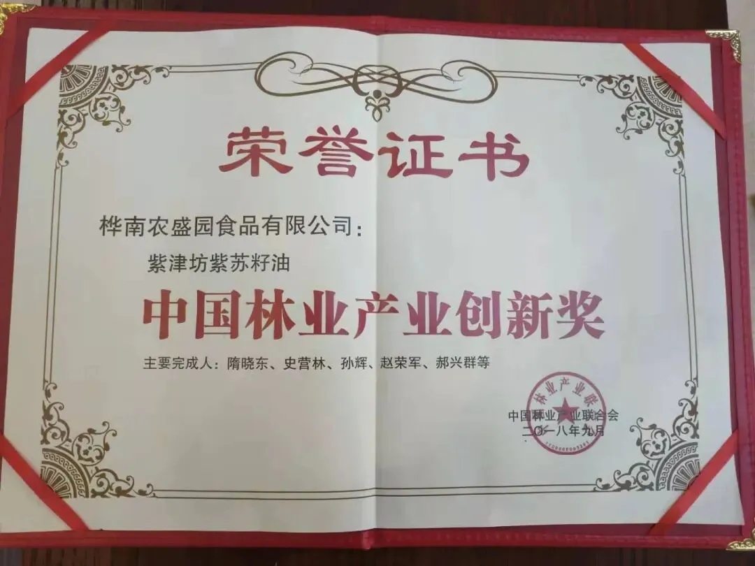 现已通过了IS09001、IS022000质量管理体系认证、HACCP食品安全管理体系认证,紫苏籽油有机认证;中国森林认证与中国森林食品认证;紫苏生态园产地认证、“桦南紫苏”地理标识;完成了16项企业标准,正式实施了《紫苏籽油》团体标准;紫苏籽油获得2017-2018年度中国林业产业创新二等奖殊荣;完善了进出口认证,桦南紫苏籽油已于2020年4月1日完成美国FDA认证。