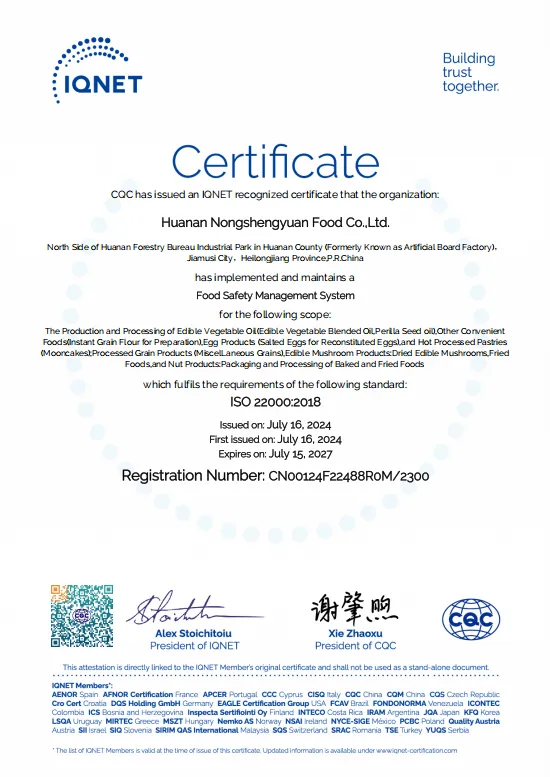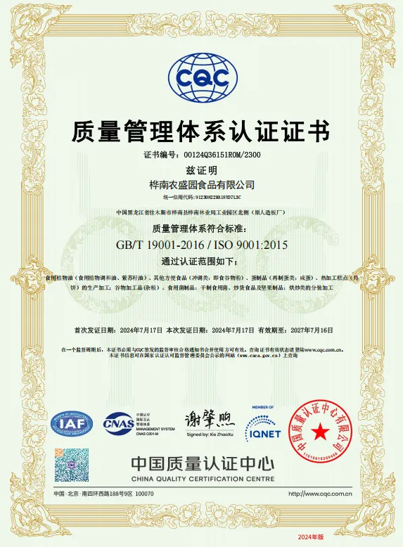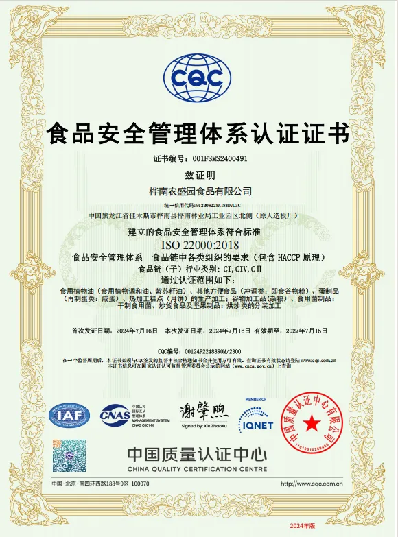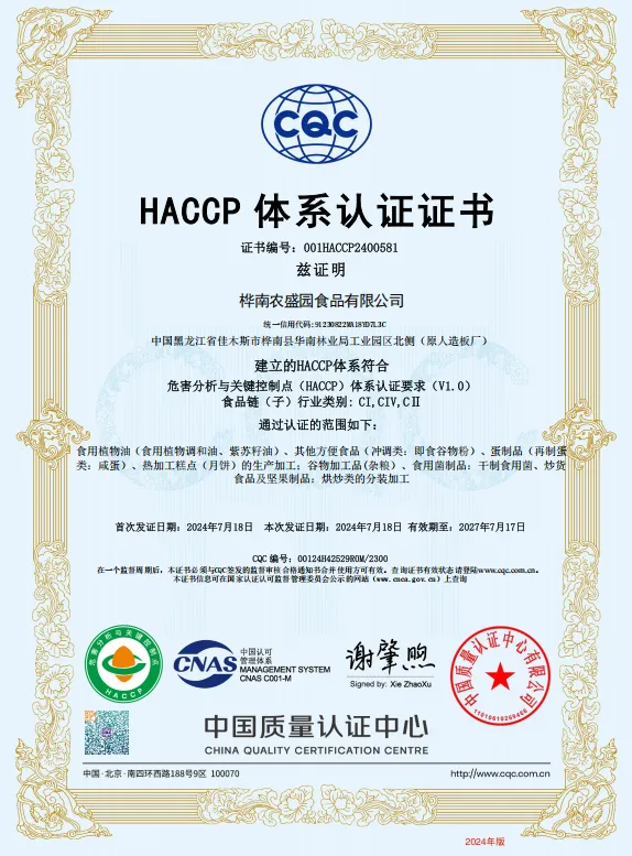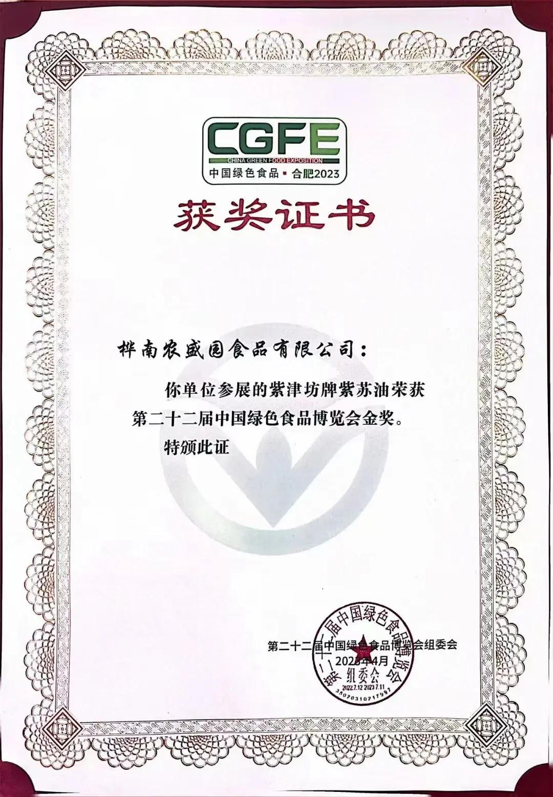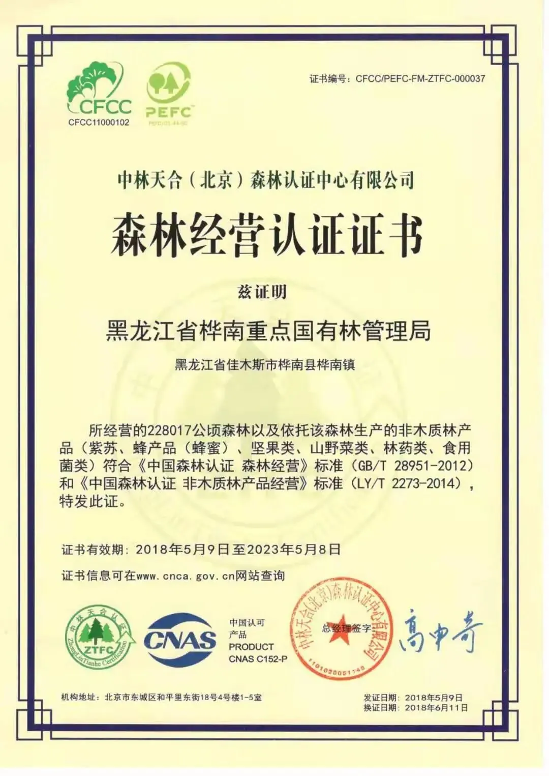 现已通过了IS09001、IS022000质量管理体系认证、HACCP食品安全管理体系认证,紫苏籽油有机认证;中国森林认证与中国森林食品认证;紫苏生态园产地认证、“桦南紫苏”地理标识;完成了16项企业标准,正式实施了《紫苏籽油》团体标准;紫苏籽油获得2017-2018年度中国林业产业创新二等奖殊荣;完善了进出口认证,桦南紫苏籽油已于2020年4月1日完成美国FDA认证。