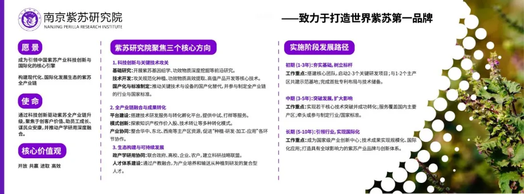 以南京紫苏研究院为桥梁,链接银启药业的生产实力,深耕紫苏产业赛道,整合优质合作资源。