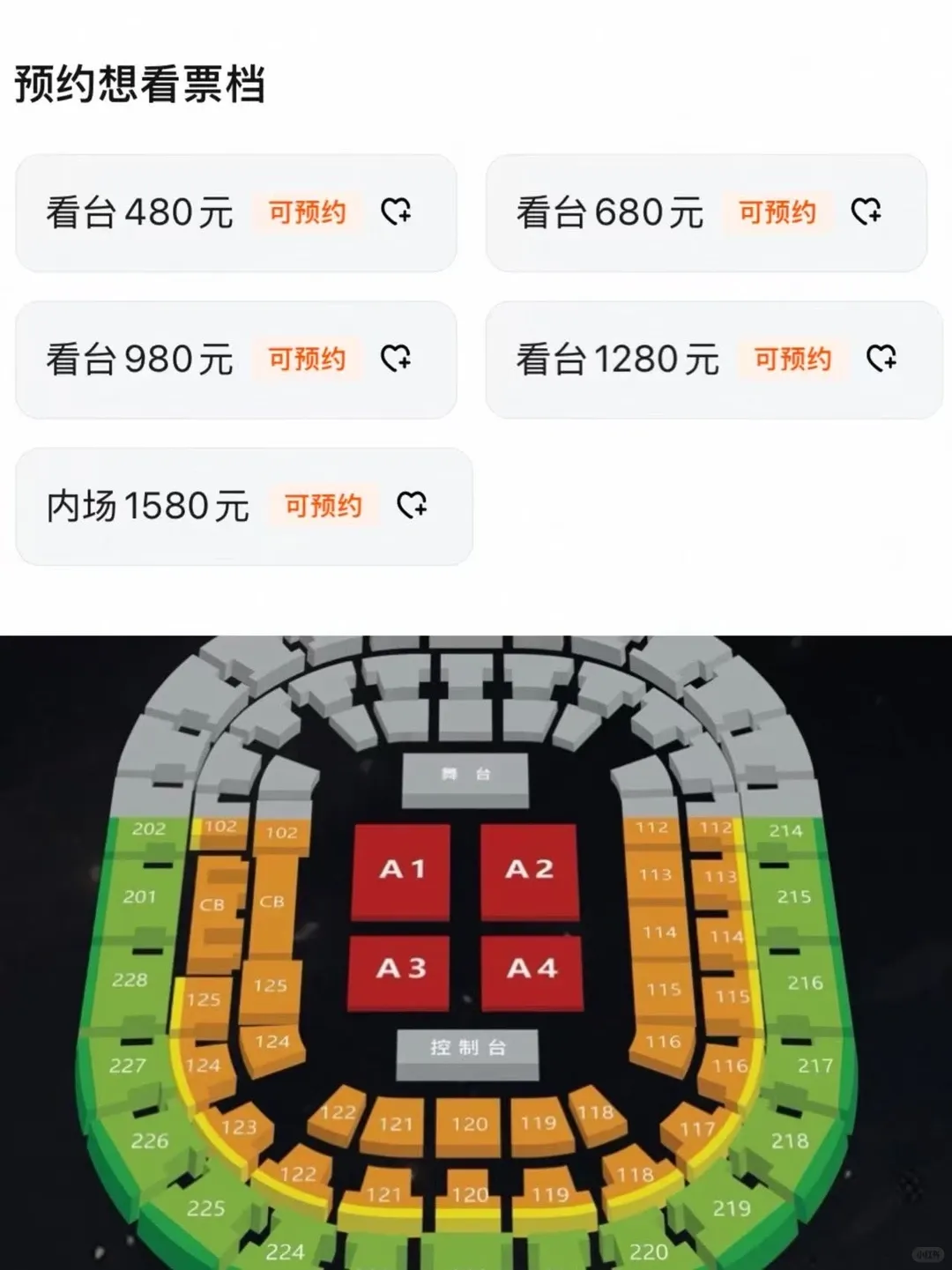 内场1580/看台1280:后排易挡、前排难抢,谨慎选择。