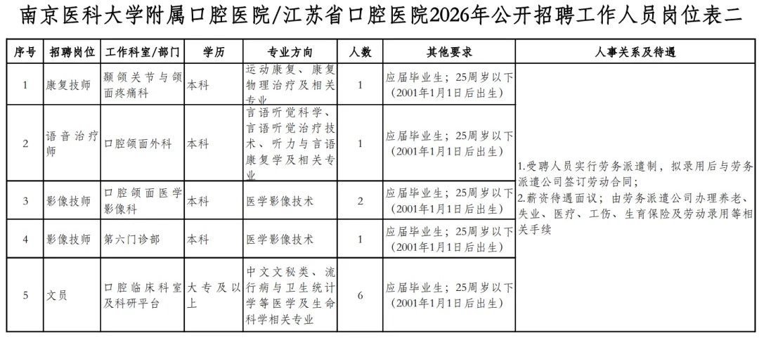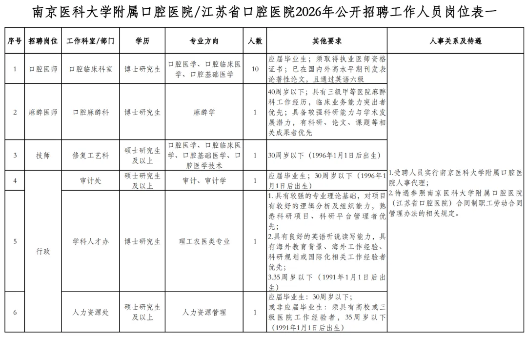 南京医科大学附属口腔医院/江苏省口腔医院2026年公开招聘工作人员公告(第二批)