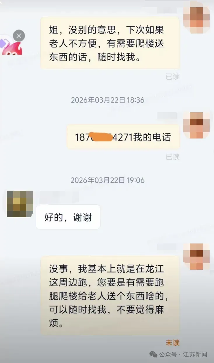 后续,该外卖骑手在送餐后主动留下联系方式,表示如果老人有需要帮助时,可以随时联系他,不必觉得麻烦。