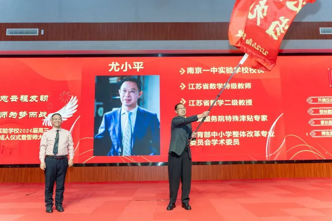 2026年3月12日16:00,南京一中实验学校2026届高三成人仪式暨高考誓师大会于养德楼三楼报告厅隆重启幕。南京一中纪委书记王越、校长尤小平、副校长黄侃、沈皖秀、高中部校长曹会跃等领导齐聚现场,全体家长温情相伴,与高三学子共赴这场青春盛典,见证成长荣光。从升国旗立报国之志,到家校师辈寄情寄语,从颁宪法、宣誓词、佩成人章扛起责任,到授出征旗、领特色班牌凝聚力量,师生同心宣誓、共启时光信箱重温初心,一幕幕皆是成长的印记、奋进的号角。十八而志,大任始承;百日冲刺,为梦而战!少年们以青春之名立誓,必将执笔为剑、不负韶华,在六月考场绽放光芒,决胜高考!