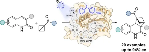 我们报道了一种人工光酶系统,该系统能够实现喹啉-2(1H)-酮与单取代二环丁烷(BCBs)之间高度对映选择性的分子间[2π+2σ]环加成反应。该平台的核心是MeO-BpAD,一种经过合理设计的光活性NAD类似物,在400 nm照射下运行,可抑制背景反应活性,同时保持对NAD依赖性蛋白的特异性结合。结合经过工程改造的Rr12αHSDH-M4突变体,这种人工光酶在广泛的BCB底物范围内,可实现手性BCHs的中至高产率,并可达到高达94%的对映体过量(ee)。